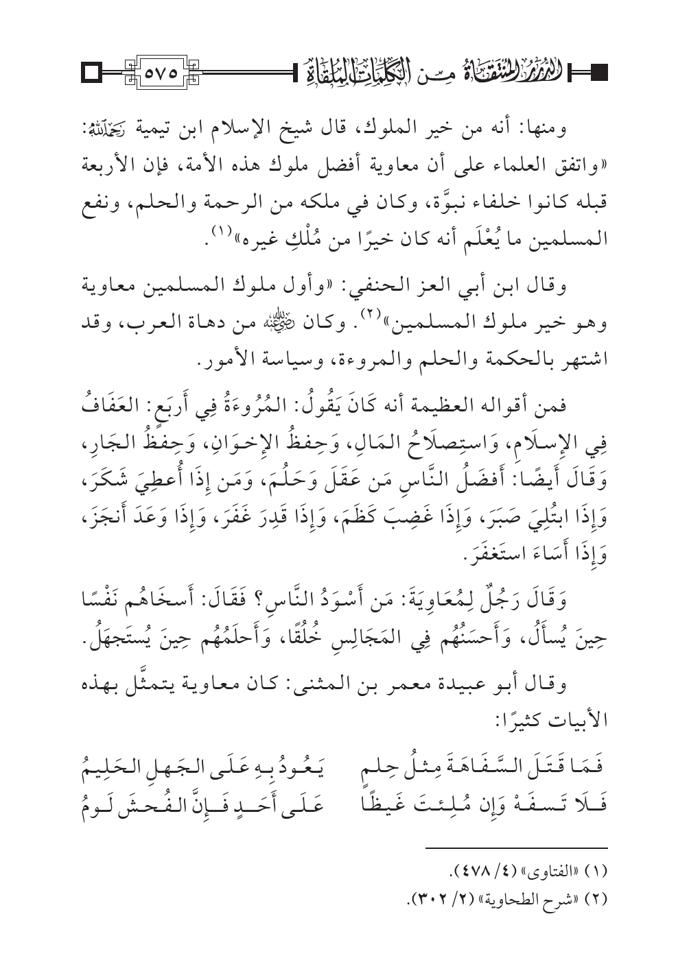 وقال ابن أبي العز الحنفي: «وأول ملوك المسلمين معاوية وهو خير ملوك المسلمين» (¬٢). وكان رضي اللهُ عنه من دهاة العرب، وقد اشتهر بالحكمة والحلم والمروءة، وسياسة الأمور.