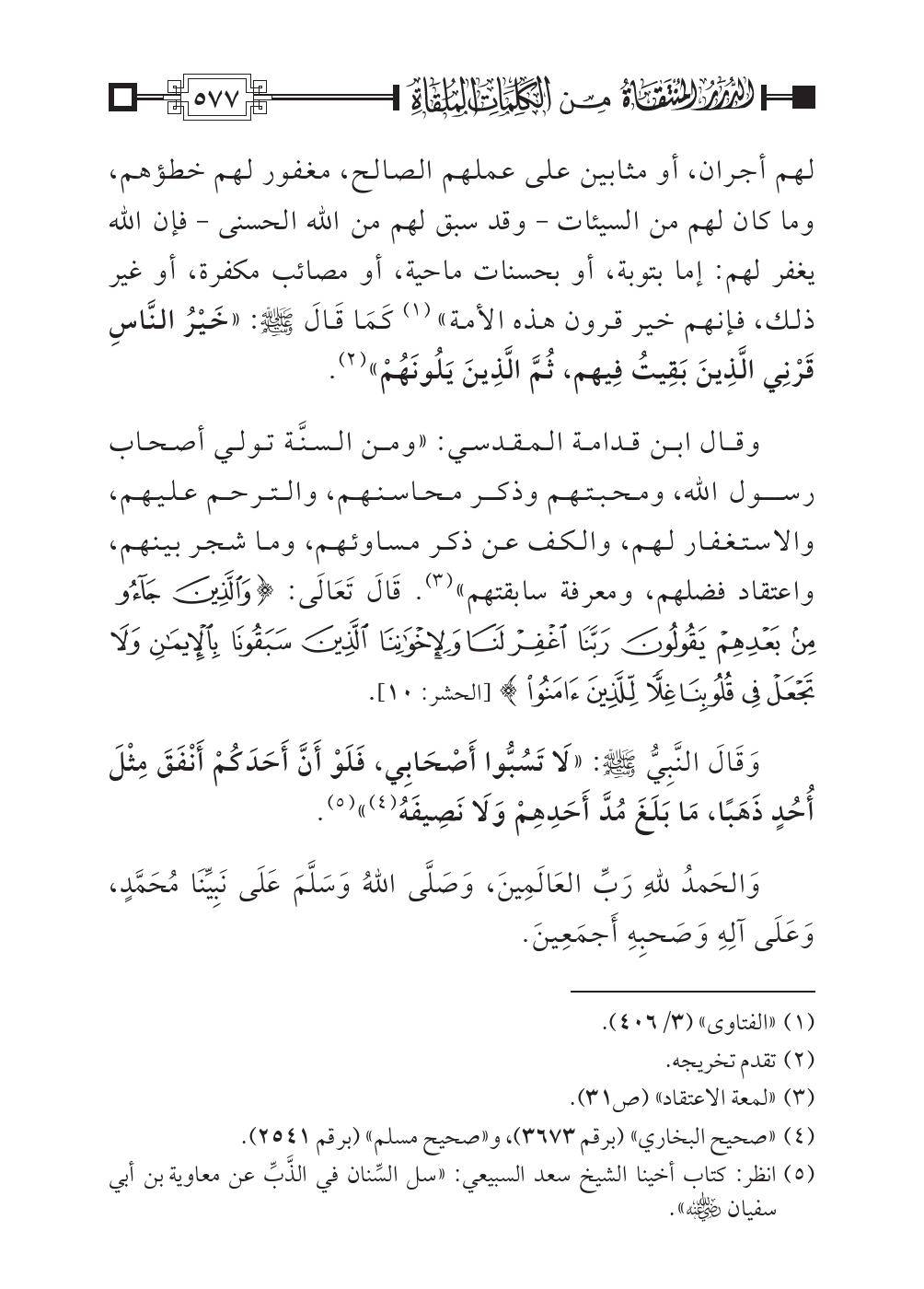وقال ابن قدامة المقدسي: «ومن السنَّة تولي أصحاب رسول الله، ومحبتهم وذكر محاسنهم، والترحم عليهم، والاستغفار لهم، والكف عن ذكر مساوئهم، وما شجر بينهم، واعتقاد فضلهم، ومعرفة سابقتهم» (¬٣). قَالَ تَعَالَى: {وَالَّذِينَ جَاؤُوا مِن بَعْدِهِمْ يَقُولُونَ رَبَّنَا اغْفِرْ لَنَا وَلإِخْوَانِنَا الَّذِينَ سَبَقُونَا بِالإِيمَانِ وَلَا تَجْعَلْ فِي قُلُوبِنَا غِلاًّ لِّلَّذِينَ آمَنُوا} [الحشر: ١٠].