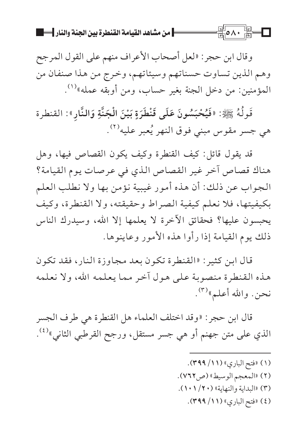 قال ابن حجر: «وقد اختلف العلماء هل القنطرة هي طرف الجسر الذي على متن جهنم أو هي جسر مستقل، ورجح القرطبي الثاني» (¬٤).