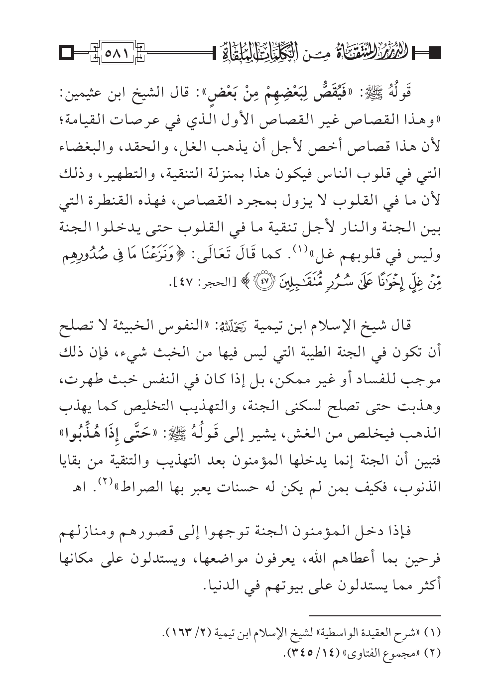 قَولُهُ صلى اللهُ عليه وسلم: «فَيُقَصُّ لِبَعْضِهِمْ مِنْ بَعْضٍ»: قال الشيخ ابن عثيمين: «وهذا القصاص غير القصاص الأول الذي في عرصات القيامة؛ لأن هذا قصاص أخص لأجل أن يذهب الغل، والحقد، والبغضاء التي في قلوب الناس فيكون هذا بمنزلة التنقية، والتطهير، وذلك لأن ما في القلوب لا يزول بمجرد القصاص، فهذه القنطرة التي بين الجنة والنار لأجل تنقية ما في القلوب حتى يدخلوا الجنة وليس في قلوبهم غل» (¬١). كما قَالَ تَعَالَى: {وَنَزَعْنَا مَا فِي صُدُورِهِم مِّنْ غِلٍّ إِخْوَانًا عَلَى سُرُرٍ مُّتَقَابِلِين (٤٧)} [الحجر: ٤٧].