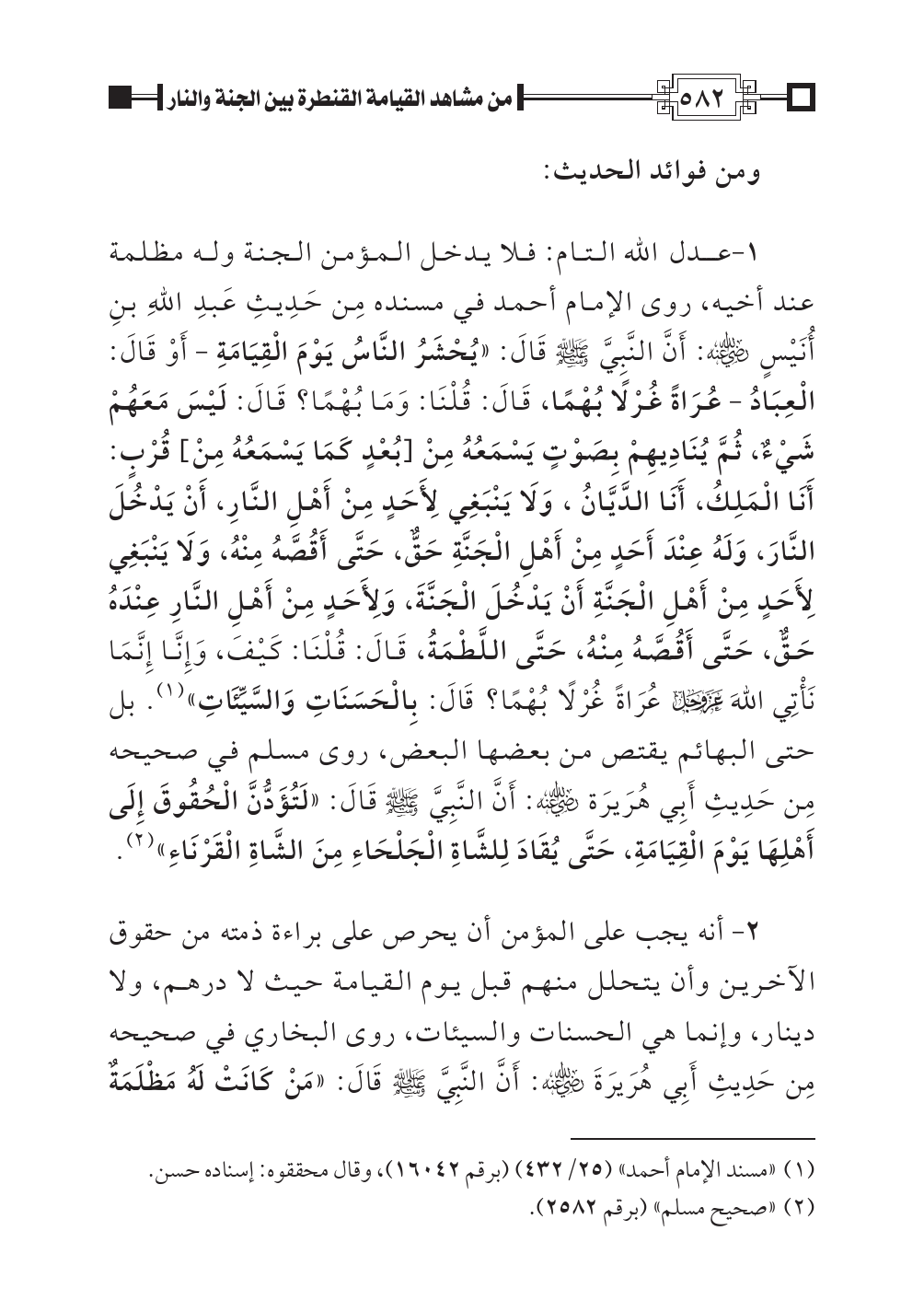 ١ - عدل الله التام: فلا يدخل المؤمن الجنة وله مظلمة عند أخيه، روى الإمام أحمد في مسنده مِن حَدِيثِ عَبدِ اللهِ بنِ أُنَيْسٍ رضي اللهُ عنه: أَنَّ النَّبِيَّ صلى اللهُ عليه وسلم قَالَ: «يُحْشَرُ النَّاسُ يَوْمَ الْقِيَامَةِ - أَوْ قَالَ: الْعِبَادُ - عُرَاةً غُرْلًا بُهْمًا، قَالَ: قُلْنَا: وَمَا بُهْمًا؟ قَالَ: لَيْسَ مَعَهُمْ شَيْءٌ، ثُمَّ يُنَادِيهِمْ بِصَوْتٍ يَسْمَعُهُ مِنْ [بُعْدٍ كَمَا يَسْمَعُهُ مِنْ] قُرْبٍ: أَنَا الْمَلِكُ، أَنَا الدَّيَّانُ، وَلَا يَنْبَغِي لِأَحَدٍ مِنْ أَهْلِ النَّارِ، أَنْ يَدْخُلَ النَّارَ، وَلَهُ عِنْدَ أَحَدٍ مِنْ أَهْلِ الْجَنَّةِ حَقٌّ، حَتَّى أَقُصَّهُ مِنْهُ، وَلَا يَنْبَغِي لِأَحَدٍ مِنْ أَهْلِ الْجَنَّةِ أَنْ يَدْخُلَ الْجَنَّةَ، وَلِأَحَدٍ مِنْ أَهْلِ النَّارِ عِنْدَهُ حَقٌّ، حَتَّى أَقُصَّهُ مِنْهُ، حَتَّى اللَّطْمَةُ، قَالَ: قُلْنَا: كَيْفَ، وَإِنَّا إِنَّمَا نَاتِي اللهَ عزَّ وجلَّ عُرَاةً غُرْلًا بُهْمًا؟ قَالَ: بِالْحَسَنَاتِ وَالسَّيِّئَاتِ» (¬١). بل حتى البهائم يقتص من بعضها البعض، روى مسلم في صحيحه مِن حَدِيثِ أَبِي هُرَيرَة رضي اللهُ عنه: أَنَّ النَّبِيَّ صلى اللهُ عليه وسلم قَالَ: «لَتُؤَدُّنَّ الْحُقُوقَ إِلَى أَهْلِهَا يَوْمَ الْقِيَامَةِ، حَتَّى يُقَادَ لِلشَّاةِ الْجَلْحَاءِ مِنَ الشَّاةِ الْقَرْنَاءِ» (¬٢).