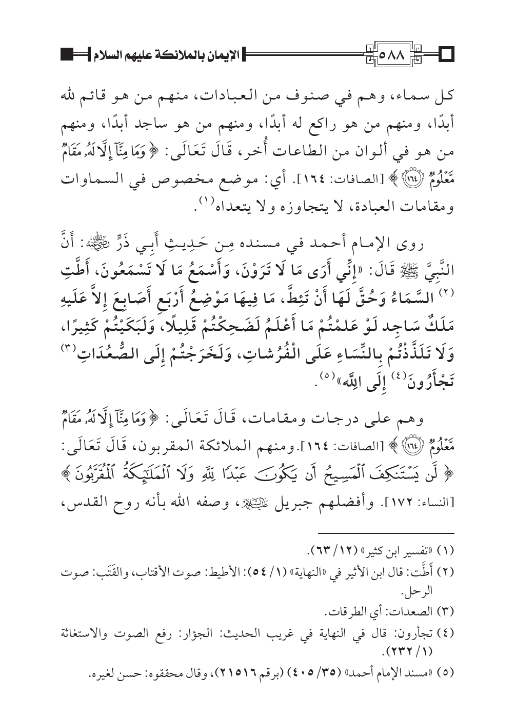 كل سماء، وهم في صنوف من العبادات، منهم من هو قائم لله أبدًا، ومنهم من هو راكع له أبدًا، ومنهم من هو ساجد أبدًا، ومنهم من هو في ألوان من الطاعات أُخر، قَالَ تَعَالَى: {وَمَا مِنَّا إِلَاّ لَهُ مَقَامٌ مَّعْلُوم (١٦٤)} [الصافات: ١٦٤]. أي: موضع مخصوص في السماوات ومقامات العبادة، لا يتجاوزه ولا يتعداه (¬١).