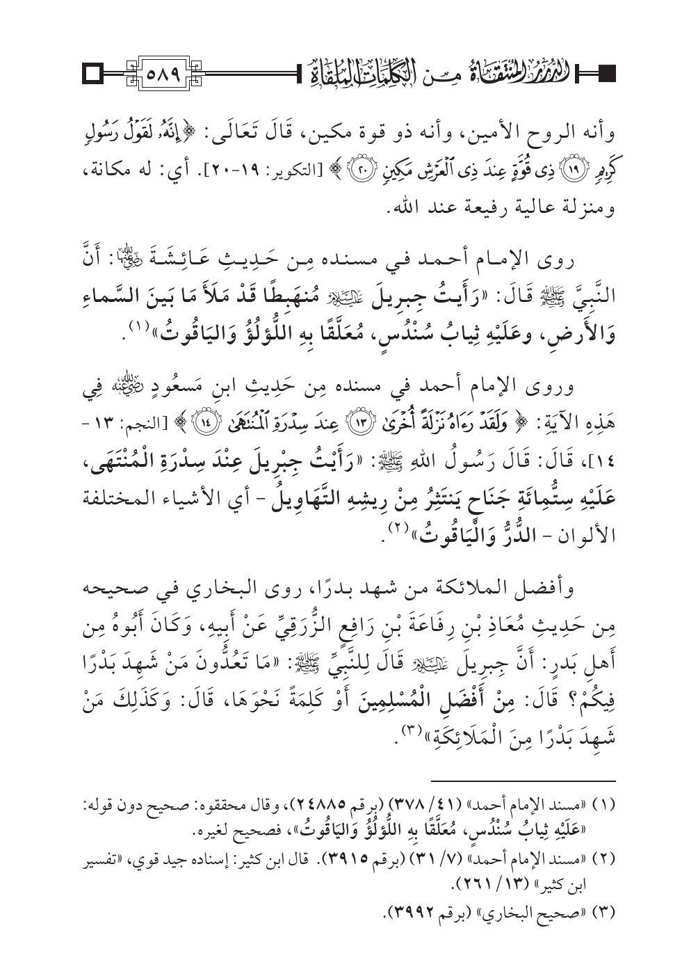 وروى الإمام أحمد في مسنده مِن حَدِيثِ ابنِ مَسعُودٍ رضي اللهُ عنه فِي هَذِهِ الآيَةِ: {وَلَقَدْ رَآهُ نَزْلَةً أُخْرَى (١٣) عِندَ سِدْرَةِ الْمُنْتَهَى (١٤)} [النجم: ١٣ - ١٤]، قَالَ: قَالَ رَسُولُ اللهِ صلى اللهُ عليه وسلم: «رَأَيْتُ جِبْرِيلَ عِنْدَ سِدْرَةِ الْمُنْتَهَى، عَلَيْهِ سِتُّمِائَةِ جَنَاحٍ يَنتَثِرُ مِنْ رِيشِهِ التَّهَاوِيلُ - أي الأشياء المختلفة الألوان - الدُّرُّ وَالْيَاقُوتُ» (¬٢).
