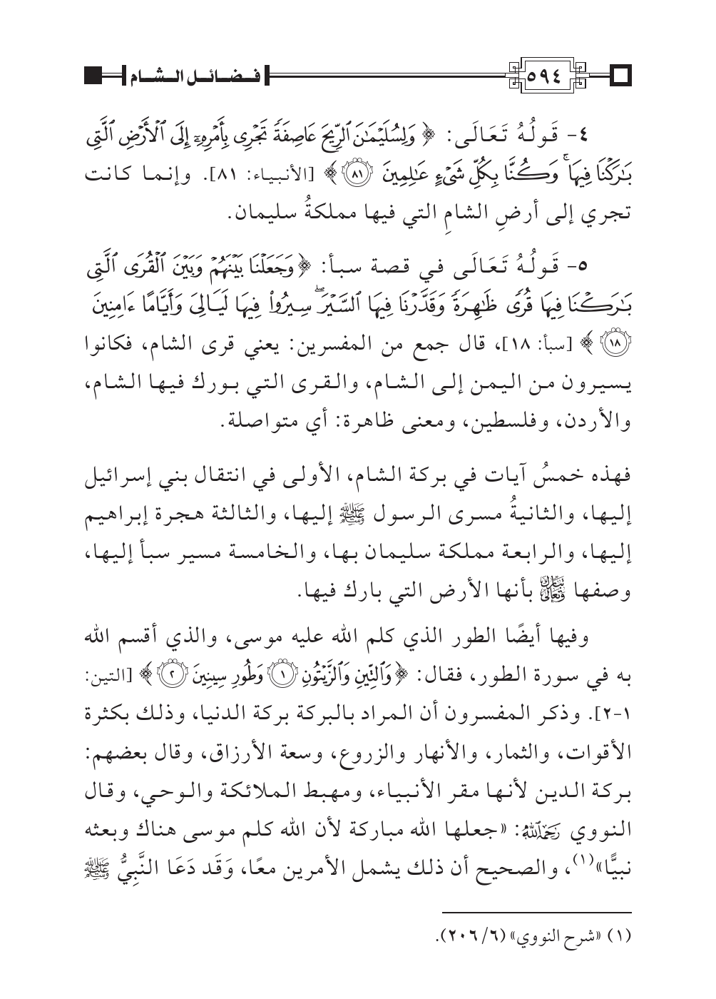 ٥ - قَولُهُ تَعَالَى في قصة سبأ: {وَجَعَلْنَا بَيْنَهُمْ وَبَيْنَ الْقُرَى الَّتِي بَارَكْنَا فِيهَا قُرًى ظَاهِرَةً وَقَدَّرْنَا فِيهَا السَّيْرَ سِيرُوا فِيهَا لَيَالِيَ وَأَيَّامًا آمِنِين (١٨)} [سبأ: ١٨]، قال جمع من المفسرين: يعني قرى الشام، فكانوا يسيرون من اليمن إلى الشام، والقرى التي بورك فيها الشام، والأردن، وفلسطين، ومعنى ظاهرة: أي متواصلة.