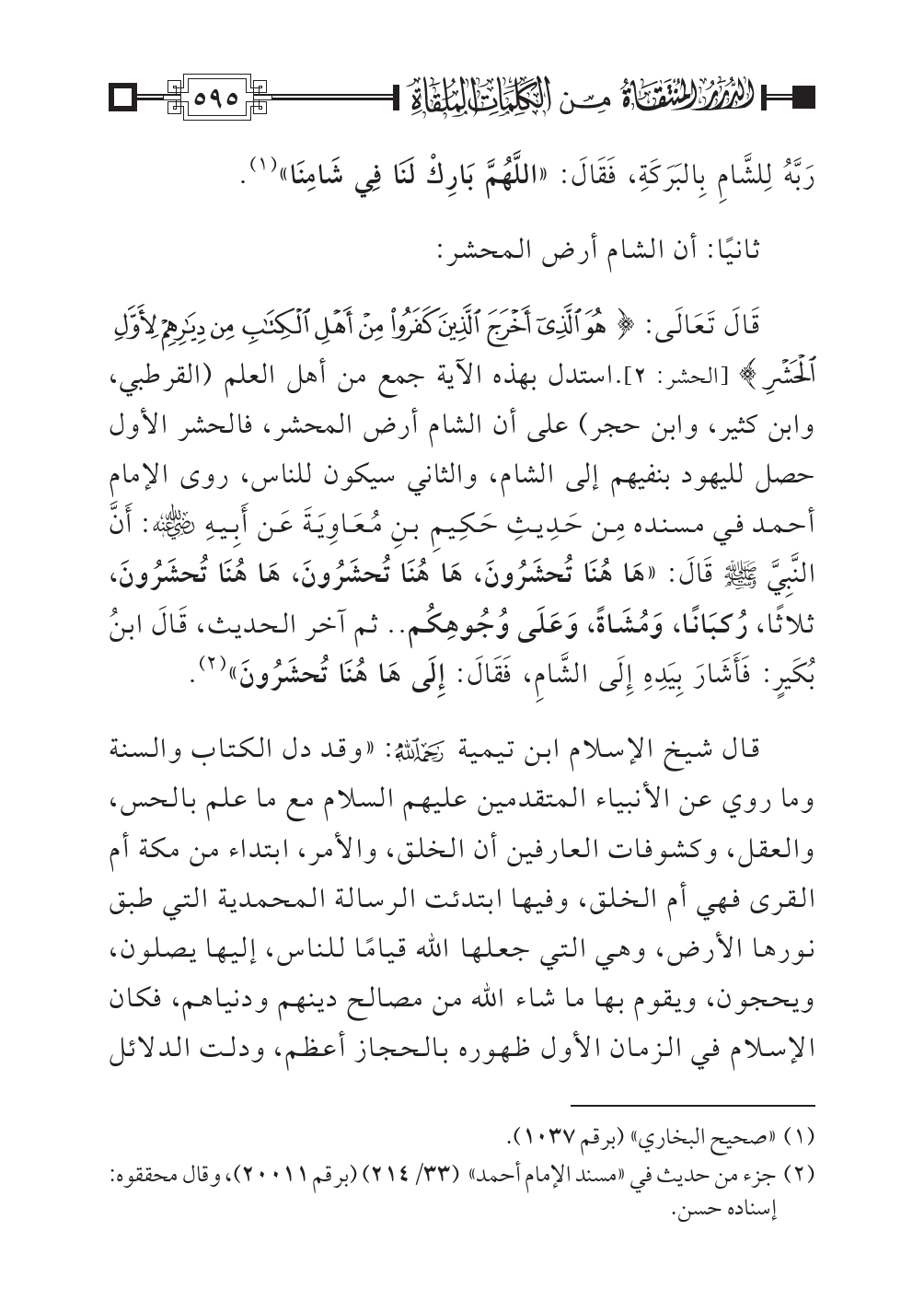 قَالَ تَعَالَى: {هُوَ الَّذِي أَخْرَجَ الَّذِينَ كَفَرُوا مِنْ أَهْلِ الْكِتَابِ مِن دِيَارِهِمْ لأَوَّلِ الْحَشْرِ} [الحشر: ٢].استدل بهذه الآية جمع من أهل العلم (القرطبي، وابن كثير، وابن حجر) على أن الشام أرض المحشر، فالحشر الأول حصل لليهود بنفيهم إلى الشام، والثاني سيكون للناس، روى الإمام أحمد في مسنده مِن حَدِيثِ حَكِيمِ بنِ مُعَاوِيَةَ عَن أَبِيهِ رضي اللهُ عنه: أَنَّ النَّبِيَّ صلى اللهُ عليه وسلم قَالَ: «هَا هُنَا تُحشَرُونَ، هَا هُنَا تُحشَرُونَ، هَا هُنَا تُحشَرُونَ، ثلاثًا، رُكبَانًا، وَمُشَاةً، وَعَلَى وُجُوهِكُم .. ثم آخر الحديث، قَالَ ابنُ بُكَيرٍ: فَأَشَارَ بِيَدِهِ إِلَى الشَّامِ، فَقَالَ: إِلَى هَا هُنَا تُحشَرُونَ» (¬٢).