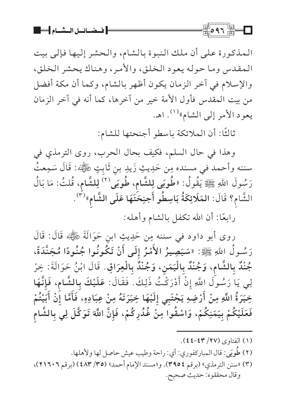 وهذا في حال السلم، فكيف بحال الحرب، روى الترمذي في سننه وأحمد في مسنده مِن حَدِيثِ زَيدِ بنِ ثَابِتٍ رضي اللهُ عنه: قَالَ سَمِعتُ رَسُولَ اللهِ صلى اللهُ عليه وسلم يَقُولُ: «طُوبَى لِلشَّامِ، طُوبَى (¬٢) لِلشَّامِ، قُلتُ: مَا بَالُ الشَّامِ؟ قَالَ: المَلَائِكَةُ بَاسِطُو أَجنِحَتَهَا عَلَى الشَّامِ» (¬٣).