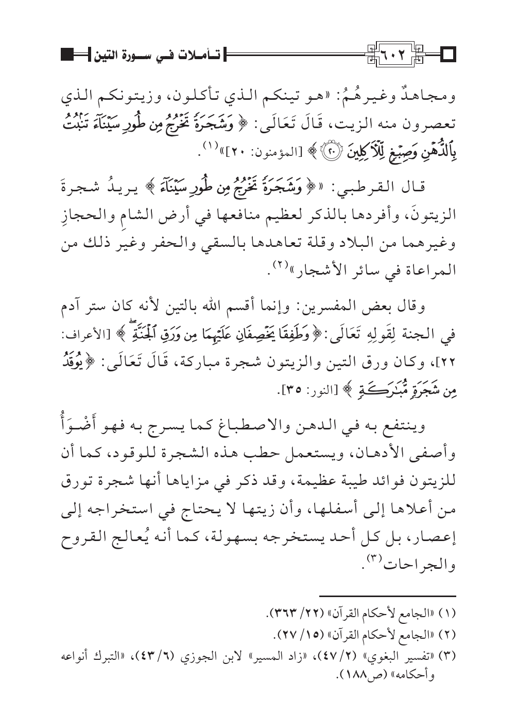قال القرطبي: «{وَشَجَرَةً تَخْرُجُ مِن طُورِ سَيْنَاء} يريدُ شجرةَ الزيتونَ، وأفردها بالذكر لعظيم منافعها في أرض الشامِ والحجازِ وغيرهما من البلاد وقلة تعاهدها بالسقي والحفر وغير ذلك من المراعاة في سائر الأشجار» (¬٢).