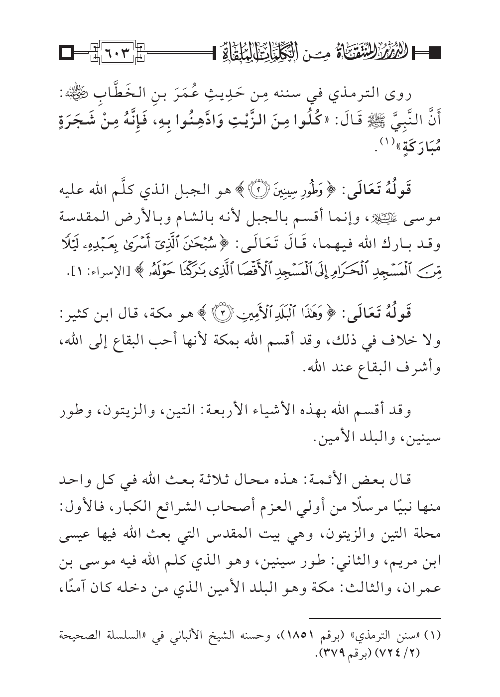 قَولُهُ تَعَالَى: {وَطُورِ سِينِين (٣)} هو الجبل الذي كلَّم الله عليه موسى عليه السلام، وإنما أقسم بالجبل لأنه بالشام وبالأرض المقدسة وقد بارك الله فيهما، قَالَ تَعَالَى: {سُبْحَانَ الَّذِي أَسْرَى بِعَبْدِهِ لَيْلاً مِّنَ الْمَسْجِدِ الْحَرَامِ إِلَى الْمَسْجِدِ الأَقْصَى الَّذِي بَارَكْنَا حَوْلَهُ} [الإسراء: ١].