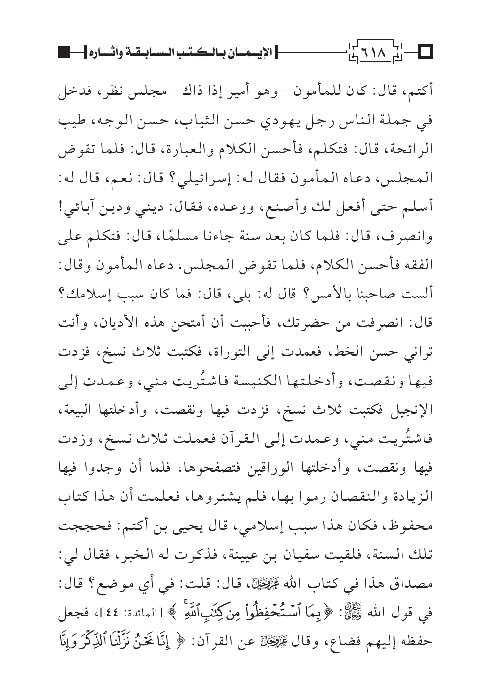 أكتم، قال: كان للمأمون - وهو أمير إذا ذاك - مجلس نظر، فدخل في جملة الناس رجل يهودي حسن الثياب، حسن الوجه، طيب الرائحة، قال: فتكلم، فأحسن الكلام والعبارة، قال: فلما تقوض المجلس، دعاه المأمون فقال له: إسرائيلي؟ قال: نعم، قال له: أسلم حتى أفعل لك وأصنع، ووعده، فقال: ديني ودين آبائي! وانصرف، قال: فلما كان بعد سنة جاءنا مسلمًا، قال: فتكلم على الفقه فأحسن الكلام، فلما تقوض المجلس، دعاه المأمون وقال: ألست صاحبنا بالأمس؟ قال له: بلى، قال: فما كان سبب إسلامك؟ قال: انصرفت من حضرتك، فأحببت أن أمتحن هذه الأديان، وأنت تراني حسن الخط، فعمدت إلى التوراة، فكتبت ثلاث نسخ، فزدت فيها ونقصت، وأدخلتها الكنيسة فاشتُريت مني، وعمدت إلى الإنجيل فكتبت ثلاث نسخ، فزدت فيها ونقصت، وأدخلتها البيعة، فاشتُريت مني، وعمدت إلى القرآن فعملت ثلاث نسخ، وزدت فيها ونقصت، وأدخلتها الوراقين فتصفحوها، فلما أن وجدوا فيها الزيادة والنقصان رموا بها، فلم يشتروها، فعلمت أن هذا كتاب محفوظ، فكان هذا سبب إسلامي، قال يحيى بن أكتم: فحججت تلك السنة، فلقيت سفيان بن عيينة، فذكرت له الخبر، فقال لي: مصداق هذا في كتاب الله عزَّ وجلَّ، قال: قلت: في أي موضع؟ قال: في قول الله تبارك وتعالى: {وَالأَحْبَارُ بِمَا اسْتُحْفِظُوا مِن كِتَابِ اللهِ} [المائدة: ٤٤]، فجعل حفظه إليهم فضاع، وقال عزَّ وجلَّ عن القرآن: {إِنَّا نَحْنُ نَزَّلْنَا الذِّكْرَ وَإِنَّا