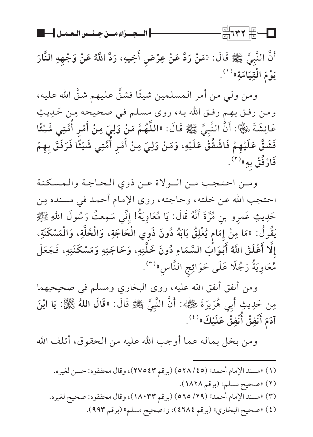 ومن احتجب من الولاة عن ذوي الحاجة والمسكنة احتجب الله عن خلته، وحاجته، روى الإمام أحمد في مسنده مِن حَدِيثِ عَمرِو بنِ مُرَّةَ أَنَّهُ قَالَ: يَا مُعَاوِيَةُ! إِنِّي سَمِعتُ رَسُولَ اللهِ صلى اللهُ عليه وسلم يَقُولُ: «مَا مِنْ إِمَامٍ يُغْلِقُ بَابَهُ دُونَ ذَوِي الْحَاجَةِ، وَالْخَلَّةِ، وَالْمَسْكَنَةِ، إِلَّا أَغْلَقَ اللَّهُ أَبْوَابَ السَّمَاءِ دُونَ خَلَّتِهِ، وَحَاجَتِهِ وَمَسْكَنَتِهِ، فَجَعَلَ مُعَاوِيَةُ رَجُلًا عَلَى حَوَائِجِ النَّاسِ» (¬٣).