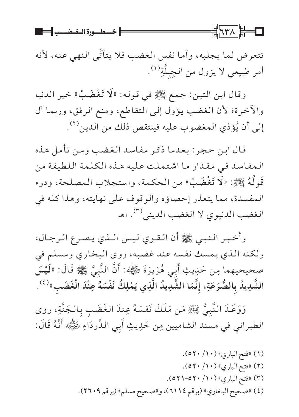 قال ابن حجر: بعدما ذكر مفاسد الغضب ومن تأمل هذه المفاسد في مقدار ما اشتملت عليه هذه الكلمة اللطيفة من قَولُهُ صلى اللهُ عليه وسلم: «لَا تَغْضَبْ» من الحكمة، واستجلاب المصلحة، ودرء المفسدة، مما يتعذر إحصاؤه والوقوف على نهايته، وهذا كله في الغضب الدنيوي لا الغضب الديني (¬٣). اهـ