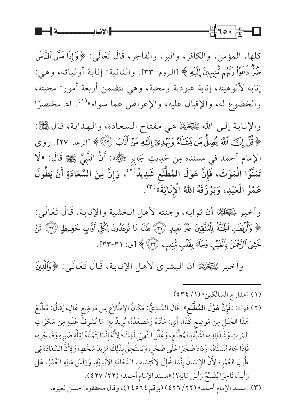 والإنابة إلى الله سبحانه هي مفتاح السعادة، والهداية، قال سبحانه وتعالى: {قُلْ إِنَّ اللهَ يُضِلُّ مَن يَشَاء وَيَهْدِي إِلَيْهِ مَنْ أَنَاب} [الرعد: ٢٧]. روى الإمام أحمد في مسنده مِن حَدِيثِ جَابِرٍ رضي اللهُ عنه: أَنَّ النَّبِيَّ صلى اللهُ عليه وسلم قَالَ: «لَا تَمَنَّوُا الْمَوْتَ، فَإِنَّ هَوْلَ المُطَّلَعِ شَدِيدٌ (¬٢)، وَإِنَّ مِنَ السَّعَادَةِ أَنْ يَطُولَ عُمْرُ الْعَبْدِ، وَيَرْزُقَهُ اللهُ الْإِنَابَةَ» (¬٣).