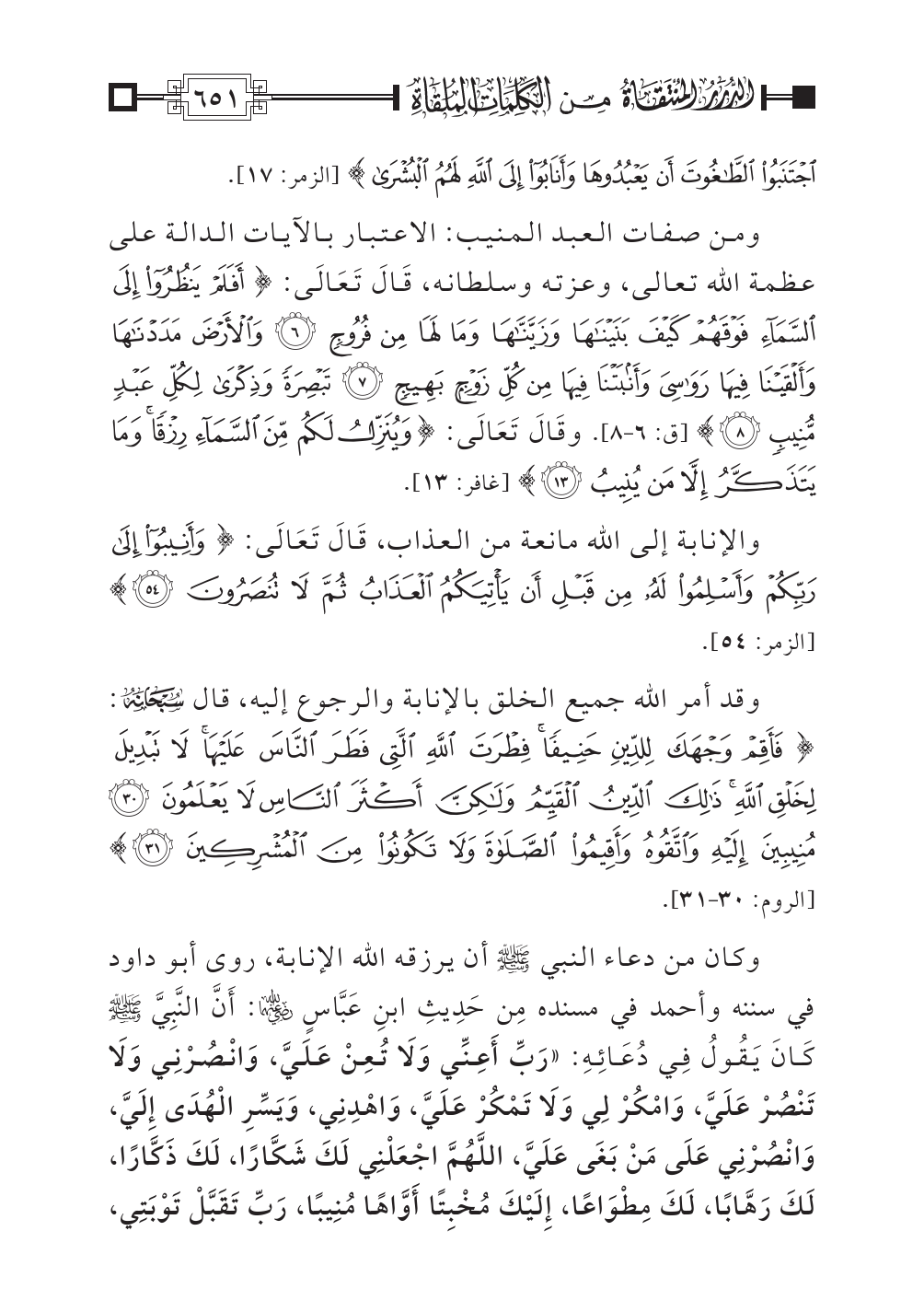 وكان من دعاء النبي صلى اللهُ عليه وسلم أن يرزقه الله الإنابة، روى أبو داود في سننه وأحمد في مسنده مِن حَدِيثِ ابنِ عَبَّاسٍ رضي اللهُ عنهما: أَنَّ النَّبِيَّ صلى اللهُ عليه وسلم كَانَ يَقُولُ فِي دُعَائِهِ: «رَبِّ أَعِنِّي وَلَا تُعِنْ عَلَيَّ، وَانْصُرْنِي وَلَا تَنْصُرْ عَلَيَّ، وَامْكُرْ لِي وَلَا تَمْكُرْ عَلَيَّ، وَاهْدِنِي، وَيَسِّرِ الْهُدَى إِلَيَّ، وَانْصُرْنِي عَلَى مَنْ بَغَى عَلَيَّ، اللَّهُمَّ اجْعَلْنِي لَكَ شَكَّارًا، لَكَ ذَكَّارًا، لَكَ رَهَّابًا، لَكَ مِطْوَاعًا، إِلَيْكَ مُخْبِتًا أَوَّاهًا مُنِيبًا، رَبِّ تَقَبَّلْ تَوْبَتِي،
