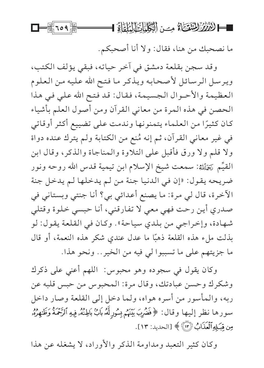 وكان يقول في سجوده وهو محبوس: اللهم أعني على ذكرك وشكرك وحسن عبادتك، وقال مرة: المحبوس من حبس قلبه عن ربه، والمأسور من أسره هواه، ولما دخل إلى القلعة وصار داخل سورها نظر إليها وقال: {فَضُرِبَ بَيْنَهُم بِسُورٍ لَّهُ بَابٌ بَاطِنُهُ فِيهِ الرَّحْمَةُ وَظَاهِرُهُ مِن قِبَلِهِ الْعَذَاب (١٣)} [الحديد: ١٣].