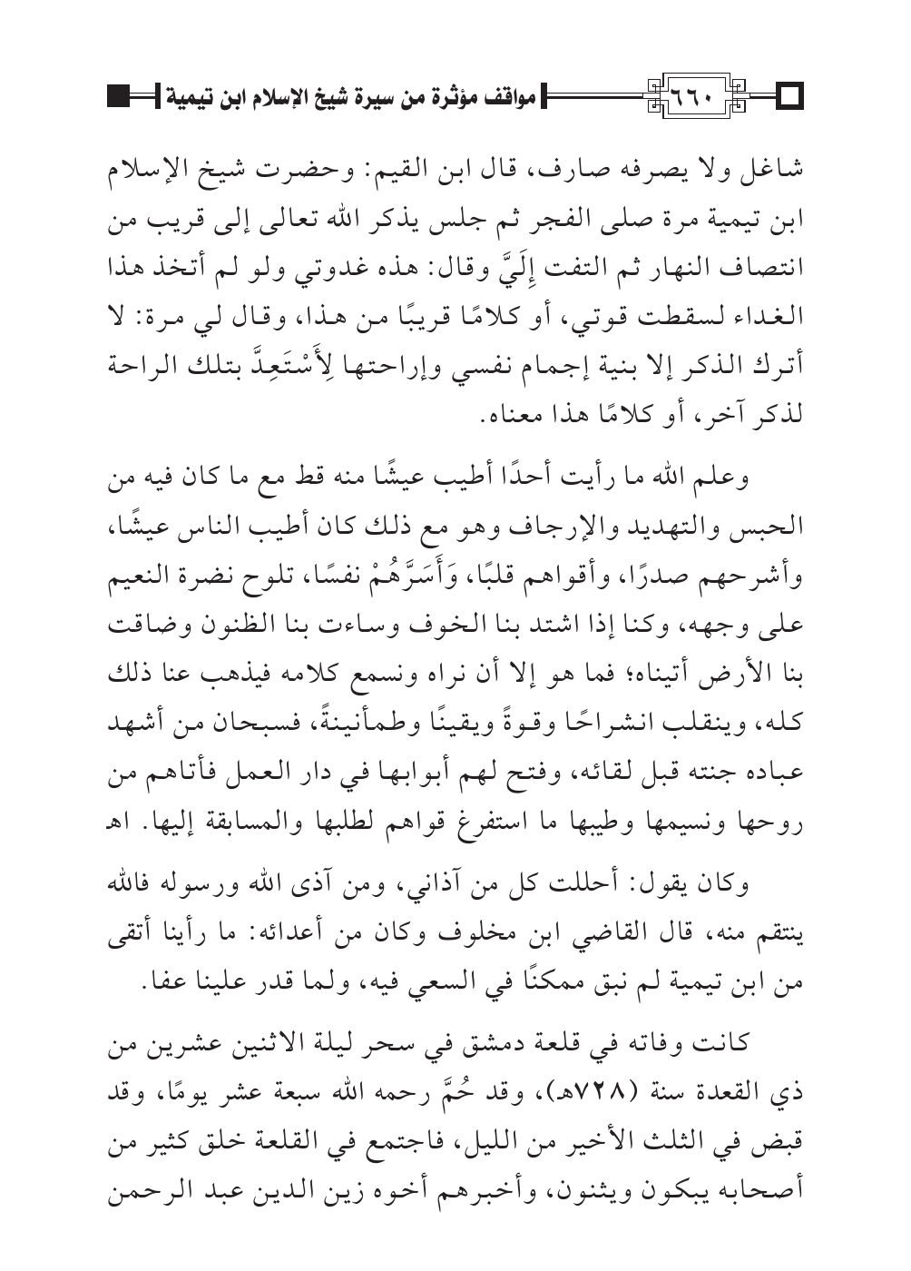 شاغل ولا يصرفه صارف، قال ابن القيم: وحضرت شيخ الإسلام ابن تيمية مرة صلى الفجر ثم جلس يذكر الله تعالى إلى قريب من انتصاف النهار ثم التفت إِلَيَّ وقال: هذه غدوتي ولو لم أتخذ هذا الغداء لسقطت قوتي، أو كلامًا قريبًا من هذا، وقال لي مرة: لا أترك الذكر إلا بنية إجمام نفسي وإراحتها لِأَسْتَعِدَّ بتلك الراحة لذكر آخر، أو كلامًا هذا معناه.