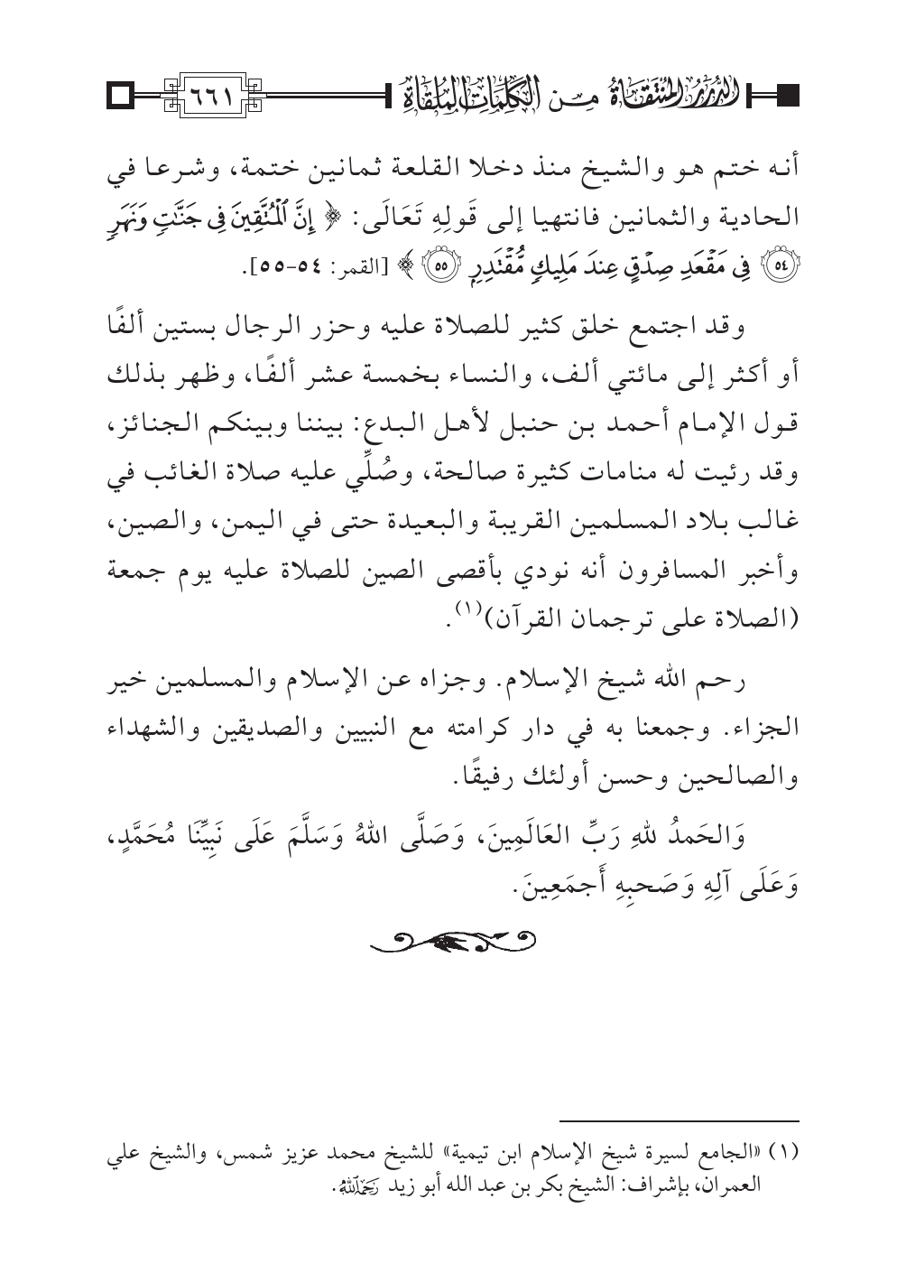 رحم الله شيخ الإسلام. وجزاه عن الإسلام والمسلمين خير الجزاء. وجمعنا به في دار كرامته مع النبيين والصديقين والشهداء والصالحين وحسن أولئك رفيقًا.