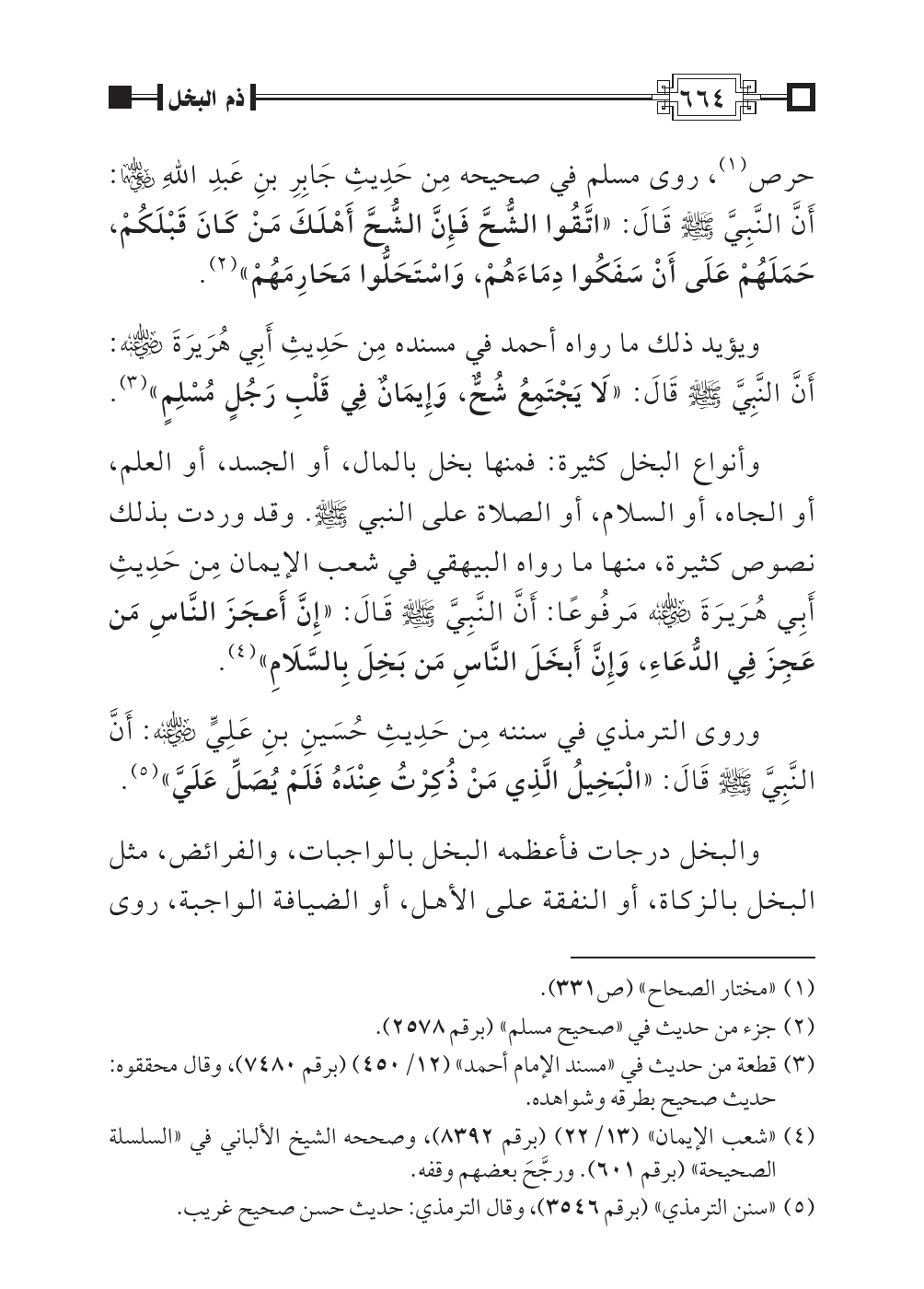 حرص (¬١)، روى مسلم في صحيحه مِن حَدِيثِ جَابِرِ بنِ عَبدِ اللهِ رضي اللهُ عنهما: أَنَّ النَّبِيَّ صلى اللهُ عليه وسلم قَالَ: «اتَّقُوا الشُّحَّ فَإِنَّ الشُّحَّ أَهْلَكَ مَنْ كَانَ قَبْلَكُمْ، حَمَلَهُمْ عَلَى أَنْ سَفَكُوا دِمَاءَهُمْ، وَاسْتَحَلُّوا مَحَارِمَهُمْ» (¬٢).