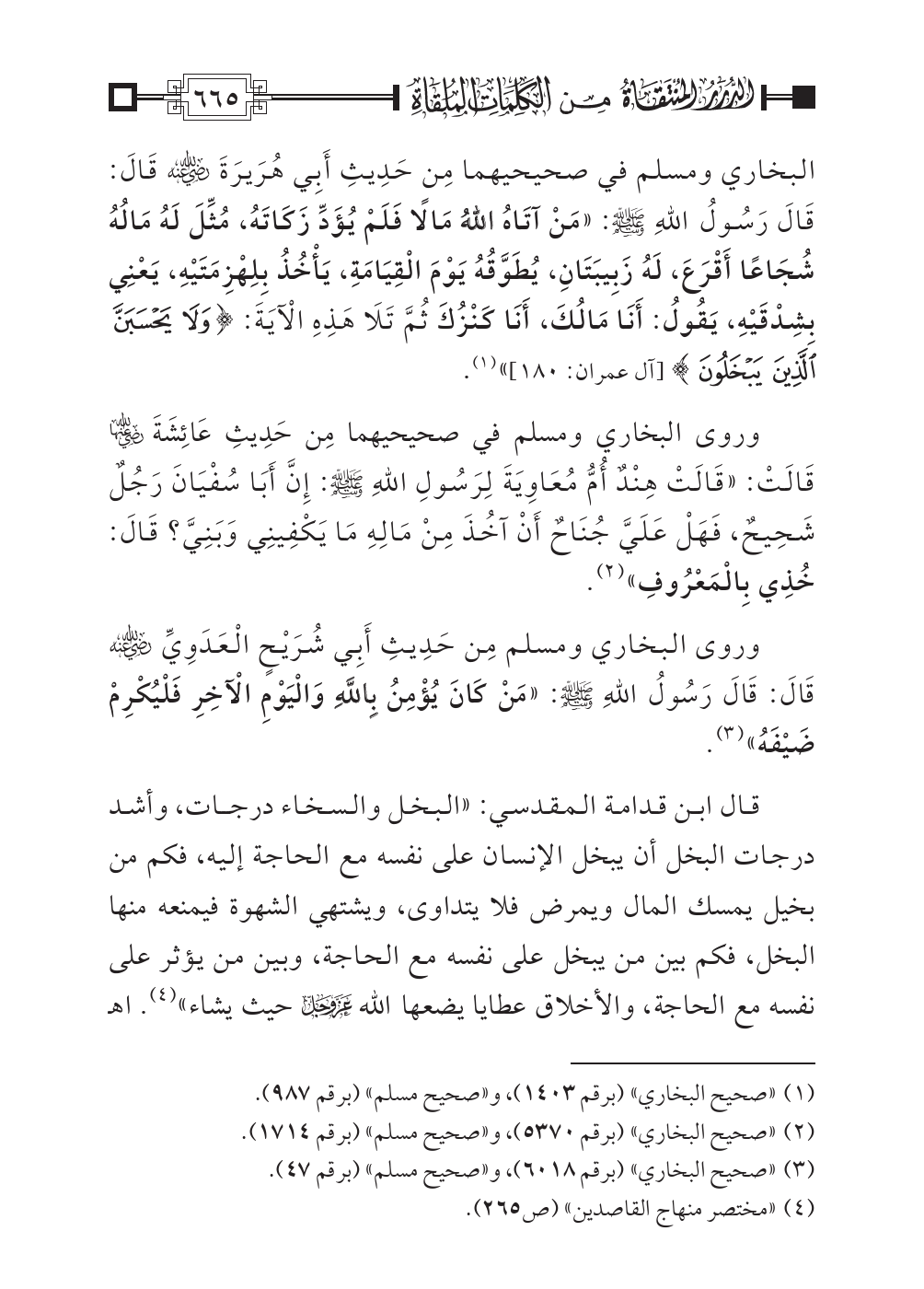 قال ابن قدامة المقدسي: «البخل والسخاء درجات، وأشد درجات البخل أن يبخل الإنسان على نفسه مع الحاجة إليه، فكم من بخيل يمسك المال ويمرض فلا يتداوى، ويشتهي الشهوة فيمنعه منها البخل، فكم بين من يبخل على نفسه مع الحاجة، وبين من يؤثر على نفسه مع الحاجة، والأخلاق عطايا يضعها الله عزَّ وجلَّ حيث يشاء» (¬٤). اهـ