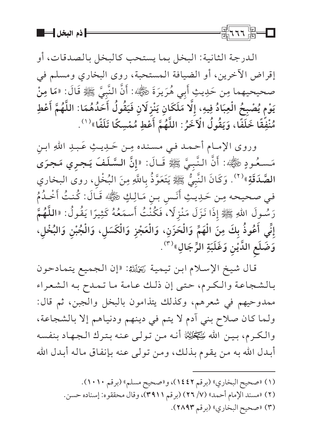 الدرجة الثانية: البخل بما يستحب كالبخل بالصدقات، أو إقراض الآخرين، أو الضيافة المستحبة، روى البخاري ومسلم في صحيحيهما مِن حَدِيثِ أَبِي هُرَيرَةَ رضي اللهُ عنه: أَنَّ النَّبِيَّ صلى اللهُ عليه وسلم قَالَ: «مَا مِنْ يَوْمٍ يُصْبِحُ الْعِبَادُ فِيهِ، إِلَّا مَلَكَانِ يَنْزِلَانِ فَيَقُولُ أَحَدُهُمَا: اللَّهُمَّ أَعْطِ مُنْفِقًا خَلَفًا، وَيَقُولُ الْآخَرُ: اللَّهُمَّ أَعْطِ مُمْسِكًا تَلَفًا» (¬١).