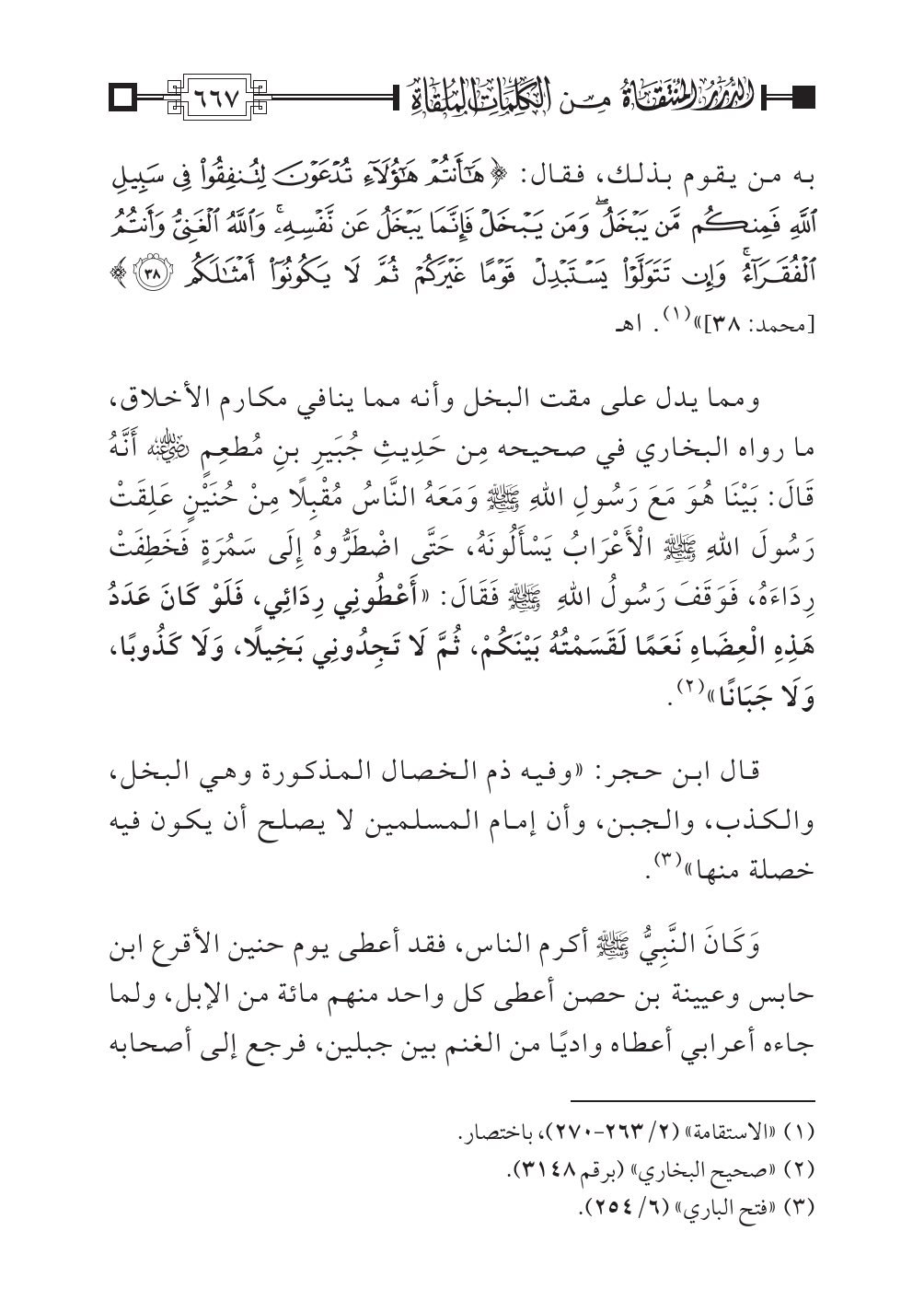 ومما يدل على مقت البخل وأنه مما ينافي مكارم الأخلاق، ما رواه البخاري في صحيحه مِن حَدِيثِ جُبَيرِ بنِ مُطعِمٍ رضي اللهُ عنه أَنَّهُ قَالَ: بَيْنَا هُوَ مَعَ رَسُولِ اللهِ صلى اللهُ عليه وسلم وَمَعَهُ النَّاسُ مُقْبِلًا مِنْ حُنَيْنٍ عَلِقَتْ رَسُولَ اللهِ صلى اللهُ عليه وسلم الْأَعْرَابُ يَسْأَلُونَهُ، حَتَّى اضْطَرُّوهُ إِلَى سَمُرَةٍ فَخَطِفَتْ رِدَاءَهُ، فَوَقَفَ رَسُولُ اللهِ صلى اللهُ عليه وسلم فَقَالَ: «أَعْطُونِي رِدَائِي، فَلَوْ كَانَ عَدَدُ هَذِهِ الْعِضَاهِ نَعَمًا لَقَسَمْتُهُ بَيْنَكُمْ، ثُمَّ لَا تَجِدُونِي بَخِيلًا، وَلَا كَذُوبًا، وَلَا جَبَانًا» (¬٢).