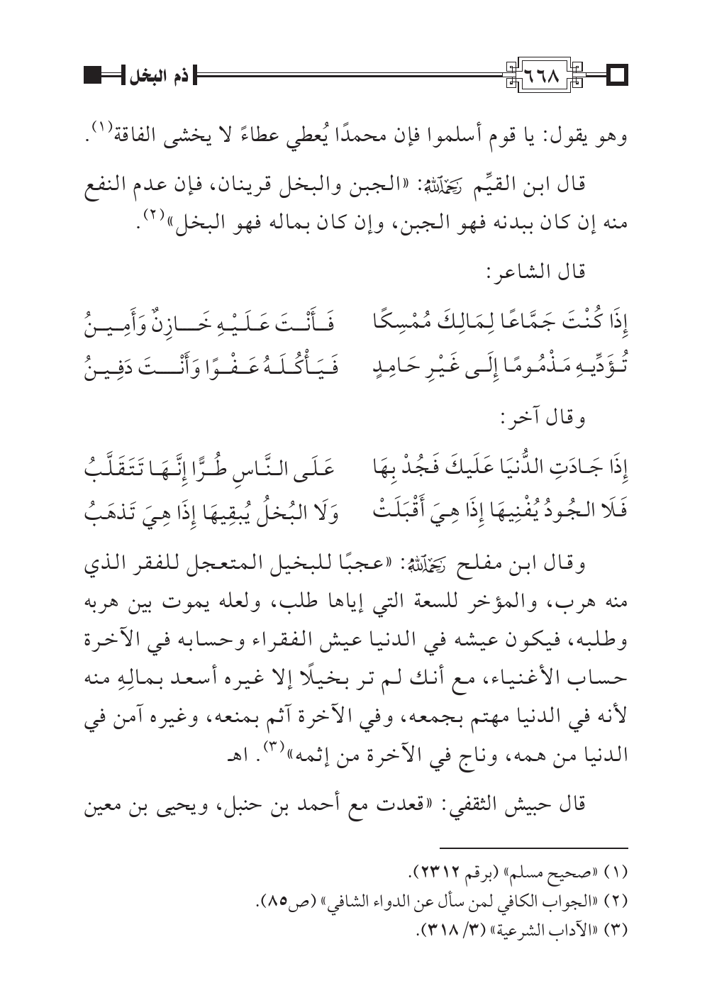 وقال ابن مفلح رحمه الله: «عجبًا للبخيل المتعجل للفقر الذي منه هرب، والمؤخر للسعة التي إياها طلب، ولعله يموت بين هربه وطلبه، فيكون عيشه في الدنيا عيش الفقراء وحسابه في الآخرة حساب الأغنياء، مع أنك لم تر بخيلًا إلا غيره أسعد بمالِهِ منه لأنه في الدنيا مهتم بجمعه، وفي الآخرة آثم بمنعه، وغيره آمن في الدنيا من همه، وناج في الآخرة من إثمه» (¬٣). اهـ