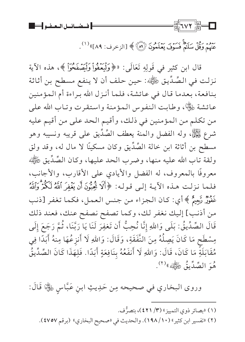 قال ابن كثير في قَولِهِ تَعَالَى: «{وَلْيَعْفُوا وَلْيَصْفَحُوا}، هذه الآية نزلت في الصِّدِّيق رضي اللهُ عنه: حين حلف أن لا ينفع مسطح بن أثاثة بنافعة، بعدما قال في عائشة، فلما أنزل الله براءة أم المؤمنين عائشة رضي اللهُ عنها، وطابت النفوس المؤمنة واستقرت وتاب الله على من تكلم من المؤمنين في ذلك، وأقيم الحد على من أقيم عليه شرع تبارك وتعالى، وله الفضل والمنة يعطف الصِّدِّيق على قريبه ونسيبه وهو مسطح بن أثاثة ابن خالة الصِّدِّيق وكان مسكينًا لا مال له، وقد ولق ولقة تاب الله عليه منها، وضرب الحد عليها، وكان الصِّدِّيق رضي اللهُ عنه معروفًا بالمعروف، له الفضل والأيادي على الأقارب، والأجانب، فلما نزلت هذه الآية إلى قوله: {أَلَا تُحِبُّونَ أَن يَغْفِرَ اللَّهُ لَكُمْ وَاللَّهُ غَفُورٌ رَّحِيم} أي: كان الجزاء من جنس العمل، فكما تغفر [ذنب من أذنب] إليك نغفر لك، وكما تصفح نصفح عنك، فعند ذلك قَالَ الصِّدِّيقُ: بَلَى وَاللهِ إِنَّا نُحِبُّ أَن تَغفِرَ لَنَا يَا رَبَّنَا، ثُمَّ رَجَعَ إِلَى مِسْطَحٍ مَا كَانَ يَصِلُهُ مِنَ النَّفَقَةِ، وَقَالَ: وَاللهِ لَا أَنزِعُهَا مِنهُ أَبَدًا فِي مُقَابَلَةِ مَا كَانَ، قَالَ: وَاللهِ لَا أَنفَعُهُ بِنَافِعَةٍ أَبَدًا. فَلِهَذَا كَانَ الصِّدِّيقُ هُوَ الصِّدِّيقُ رضي اللهُ عنه» (¬٢).