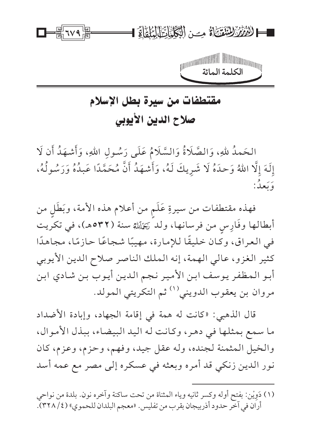 فهذه مقتطفات من سيرةِ عَلَمٍ من أعلام هذه الأمة، وبَطَلٍ من أبطالها وفَارِسٍ من فرسانها، ولد رحمه الله سنة (٥٣٢ هـ)، في تكريت في العراق، وكان خليقًا للإمارة، مهيبًا شجاعًا حازمًا، مجاهدًا كثير الغزو، عالي الهمة، إنه الملك الناصر صلاح الدين الأيوبي أبو المظفر يوسف ابن الأمير نجم الدين أيوب بن شادي ابن مروان بن يعقوب الدويني (¬١) ثم التكريتي المولد.