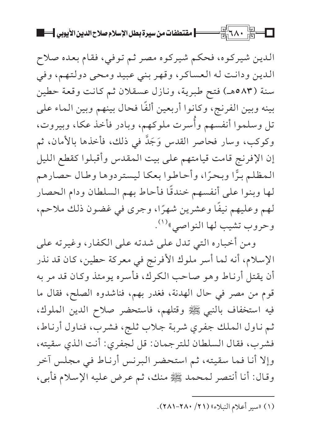 ومن أخباره التي تدل على شدته على الكفار، وغيرته على الإسلام، أنه لما أسر ملوك الأفرنج في معركة حطين، كان قد نذر أن يقتل أرناط وهو صاحب الكرك، فأسره يومئذ وكان قد مر به قوم من مصر في حال الهدنة، فغدر بهم، فناشدوه الصلح، فقال ما فيه استخفاف بالنبي صلى اللهُ عليه وسلم وقتلهم، فاستحضر صلاح الدين الملوك، ثم ناول الملك جفري شربة جلاب ثلج، فشرب، فناول أرناط، فشرب، فقال السلطان للترجمان: قل لجفري: أنت الذي سقيته، وإلا أنا فما سقيته، ثم استحضر البرنس أرناط في مجلس آخر وقال: أنا أنتصر لمحمد صلى اللهُ عليه وسلم منك، ثم عرض عليه الإسلام فأبى،