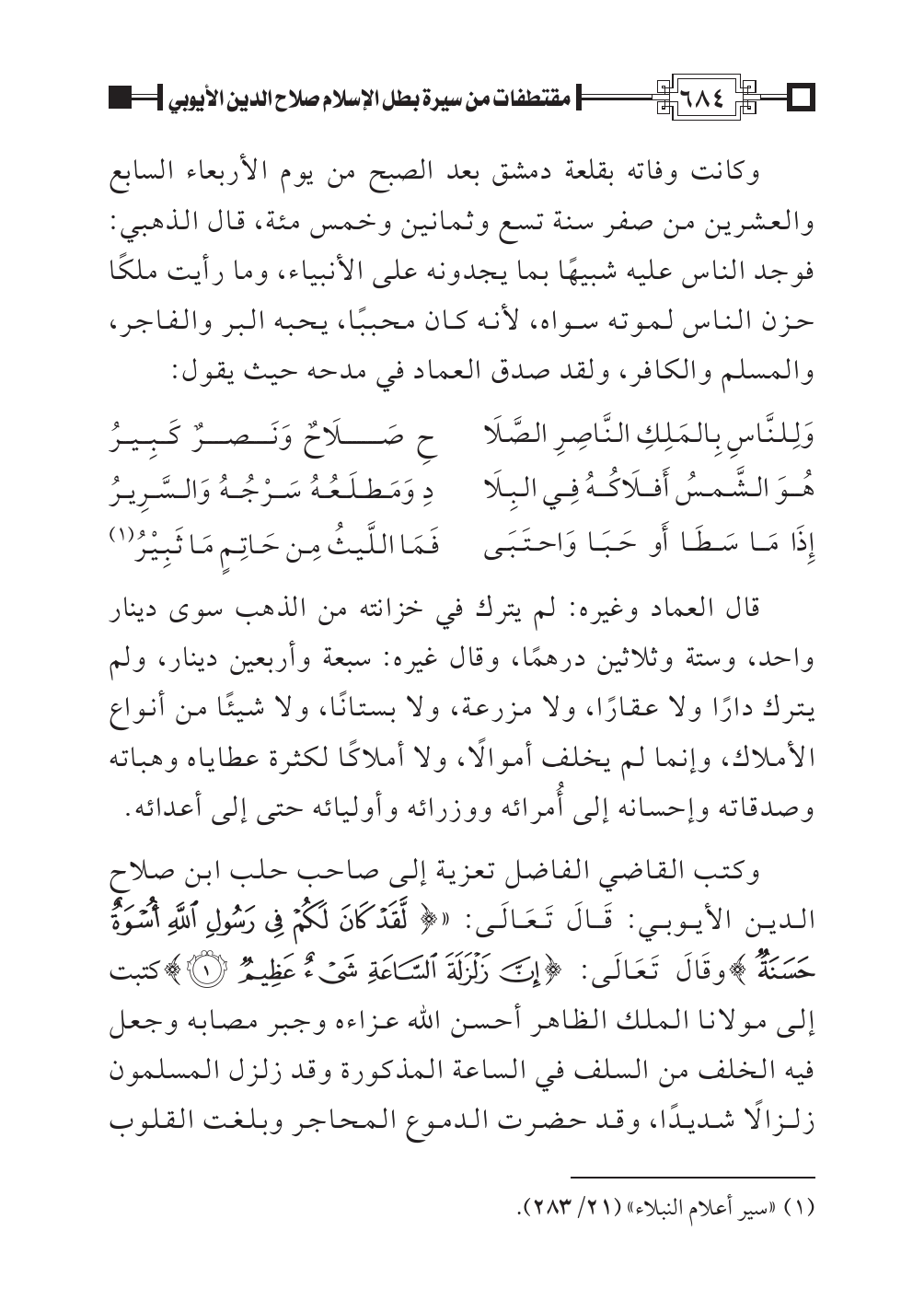 وكتب القاضي الفاضل تعزية إلى صاحب حلب ابن صلاح الدين الأيوبي: قَالَ تَعَالَى: «{لَقَدْ كَانَ لَكُمْ فِي رَسُولِ اللَّهِ أُسْوَةٌ حَسَنَةٌ} وقَالَ تَعَالَى: {إِنَّ زَلْزَلَةَ السَّاعَةِ شَيْءٌ عَظِيم (١)} كتبت إلى مولانا الملك الظاهر أحسن الله عزاءه وجبر مصابه وجعل فيه الخلف من السلف في الساعة المذكورة وقد زلزل المسلمون زلزالًا شديدًا، وقد حضرت الدموع المحاجر وبلغت القلوب