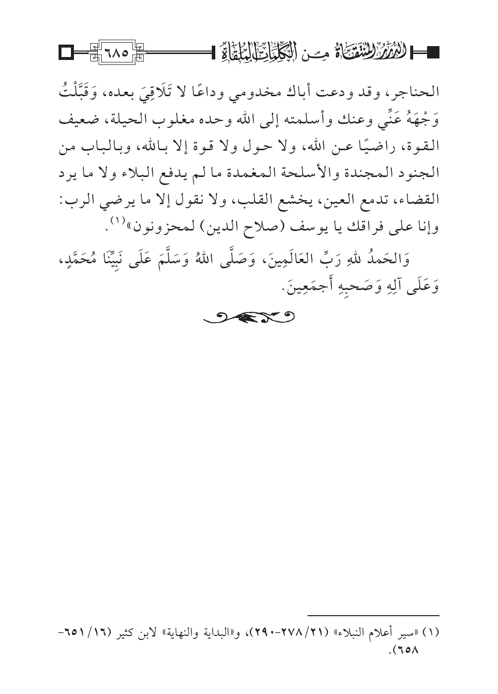 الحناجر، وقد ودعت أباك مخدومي وداعًا لا تَلَاقِيَ بعده، وَقَبَّلْتُ وَجْهَهُ عَنِّي وعنك وأسلمته إلى الله وحده مغلوب الحيلة، ضعيف القوة، راضيًا عن الله، ولا حول ولا قوة إلا بالله، وبالباب من الجنود المجندة والأسلحة المغمدة ما لم يدفع البلاء ولا ما يرد القضاء، تدمع العين، يخشع القلب، ولا نقول إلا ما يرضي الرب: وإنا على فراقك يا يوسف (صلاح الدين) لمحزونون» (¬١).