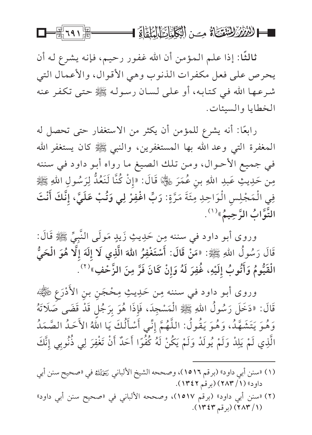 رابعًا: أنه يشرع للمؤمن أن يكثر من الاستغفار حتى تحصل له المغفرة التي وعد الله بها المستغفرين، والنبي صلى اللهُ عليه وسلم كان يستغفر الله في جميع الأحوال، ومن تلك الصيغ ما رواه أبو داود في سننه مِن حَدِيثِ عَبدِ اللهِ بنِ عُمَرَ رضي اللهُ عنهما قَالَ: «إِنْ كُنَّا لَنَعُدُّ لِرَسُولِ اللهِ صلى اللهُ عليه وسلم فِي الْمَجْلِسِ الْوَاحِدِ مِئَةَ مَرَّةٍ: رَبِّ اغْفِرْ لِي وَتُبْ عَلَيَّ، إِنَّكَ أَنْتَ التَّوَّابُ الرَّحِيمُ» (¬١).
