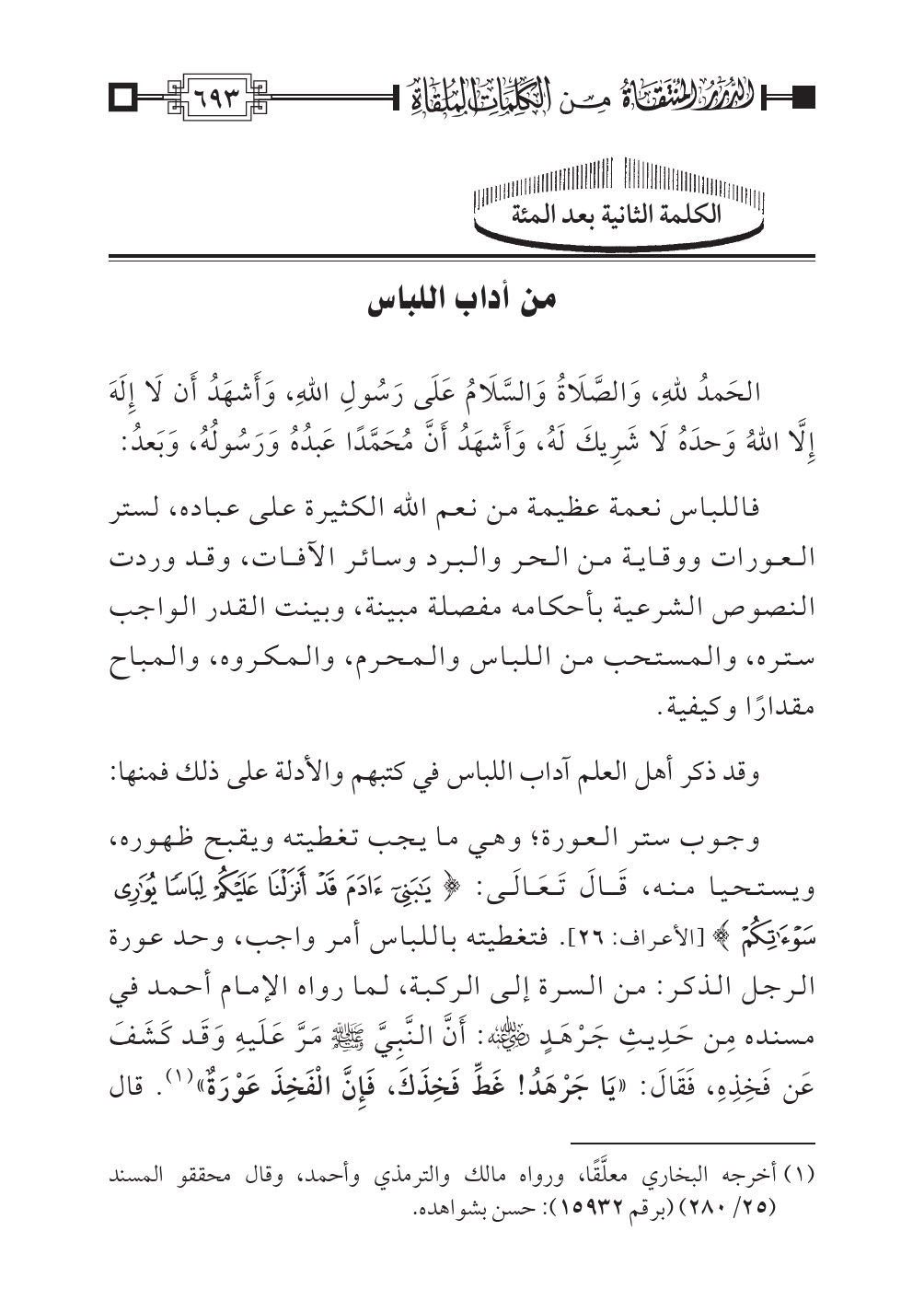 وجوب ستر العورة؛ وهي ما يجب تغطيته ويقبح ظهوره، ويستحيا منه، قَالَ تَعَالَى: {يَا بَنِي آدَمَ قَدْ أَنْزَلْنَا عَلَيْكُمْ لِبَاسًا يُوَارِي سَوْآتِكُمْ} [الأعراف: ٢٦]. فتغطيته باللباس أمر واجب، وحد عورة الرجل الذكر: من السرة إلى الركبة، لما رواه الإمام أحمد في مسنده مِن حَدِيثِ جَرْهَدٍ رضي اللهُ عنه: أَنَّ النَّبِيَّ صلى اللهُ عليه وسلم مَرَّ عَلَيهِ وَقَد كَشَفَ عَن فَخِذِهِ، فَقَالَ: «يَا جَرْهَدُ! غَطِّ فَخِذَكَ، فَإِنَّ الْفَخِذَ عَوْرَةٌ» (¬١). قال