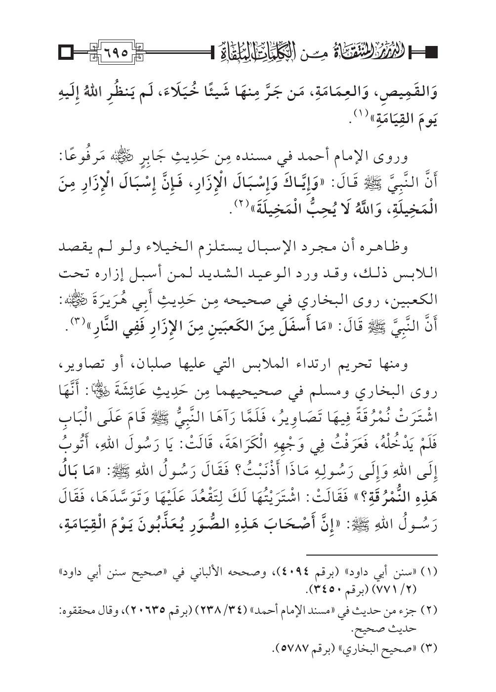 وَالقَمِيصِ، وَالعِمَامَةِ، مَن جَرَّ مِنهَا شَيئًا خُيَلَاءَ، لَم يَنظُرِ اللهُ إِلَيهِ يَومَ القِيَامَةِ» (¬١).