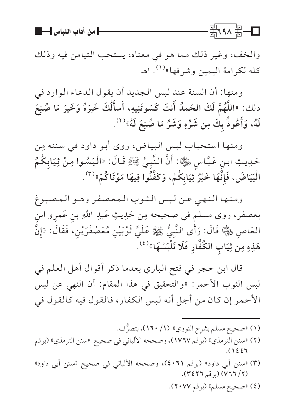 ومنها: أن السنة عند لبس الجديد أن يقول الدعاء الوارد في ذلك: «اللَّهُمَّ لَكَ الحَمدُ أَنتَ كَسَوتَنِيهِ، أَسأَلُكَ خَيرَهُ وَخَيرَ مَا صُنِعَ لَهُ، وَأَعُوذُ بِكَ مِن شَرِّهِ وَشَرِّ مَا صُنِعَ لَهُ» (¬٢).