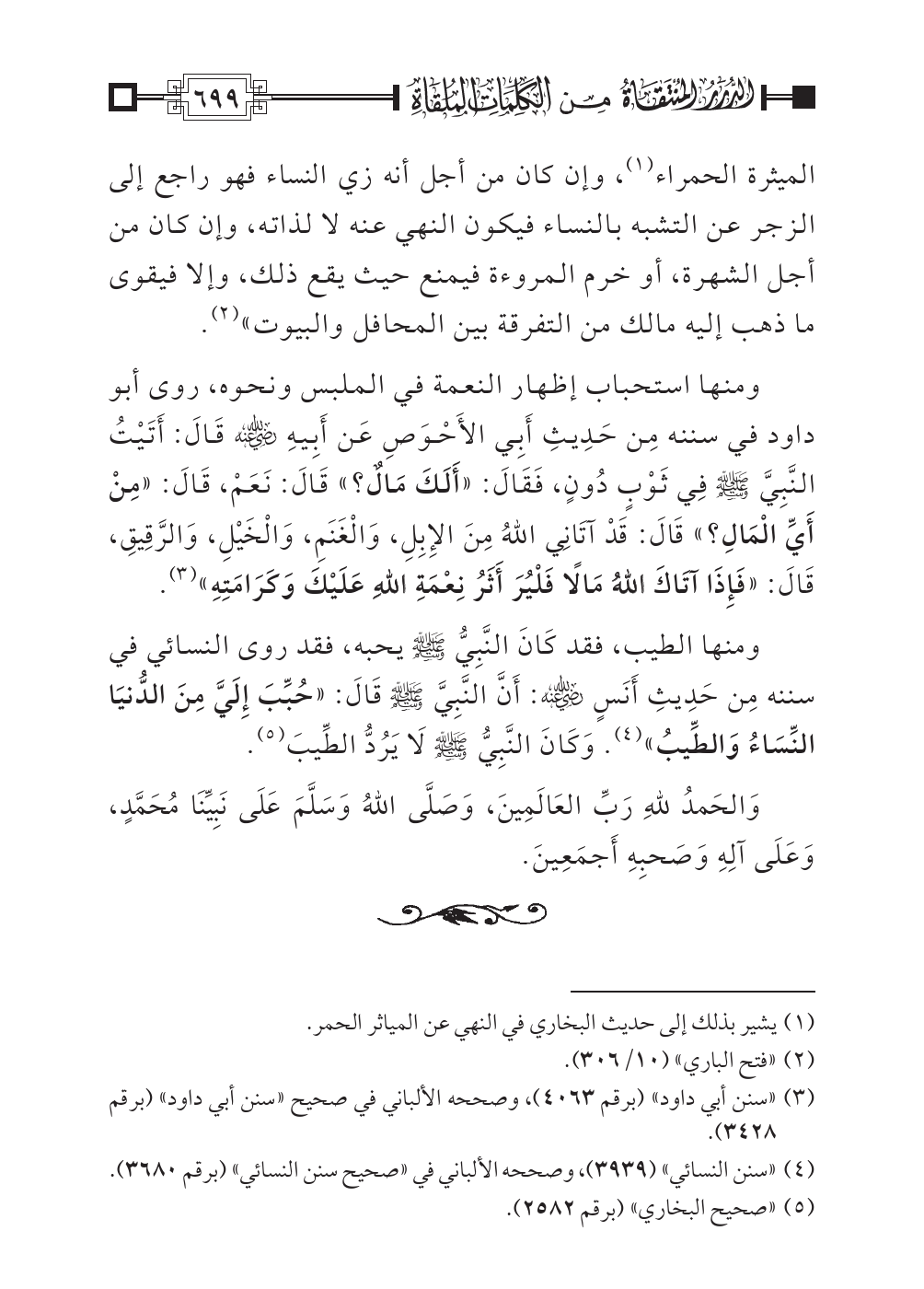 ومنها استحباب إظهار النعمة في الملبس ونحوه، روى أبو داود في سننه مِن حَدِيثِ أَبِي الأَحْوَصِ عَن أَبِيهِ رضي اللهُ عنه قَالَ: أَتَيْتُ النَّبِيَّ صلى اللهُ عليه وسلم فِي ثَوْبٍ دُونٍ، فَقَالَ: «أَلَكَ مَالٌ؟ » قَالَ: نَعَمْ، قَالَ: «مِنْ أَيِّ الْمَالِ؟ » قَالَ: قَدْ آتَانِي اللهُ مِنَ الإِبِلِ، وَالْغَنَمِ، وَالْخَيْلِ، وَالرَّقِيقِ، قَالَ: «فَإِذَا آتَاكَ اللهُ مَالًا فَلْيُرَ أَثَرُ نِعْمَةِ اللهِ عَلَيْكَ وَكَرَامَتِهِ» (¬٣).