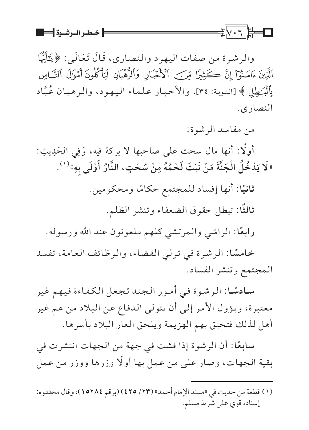 سابعًا: أن الرشوة إذا فشت في جهة من الجهات انتشرت في بقية الجهات، وصار على من عمل بها أولًا وزرها ووزر من عمل