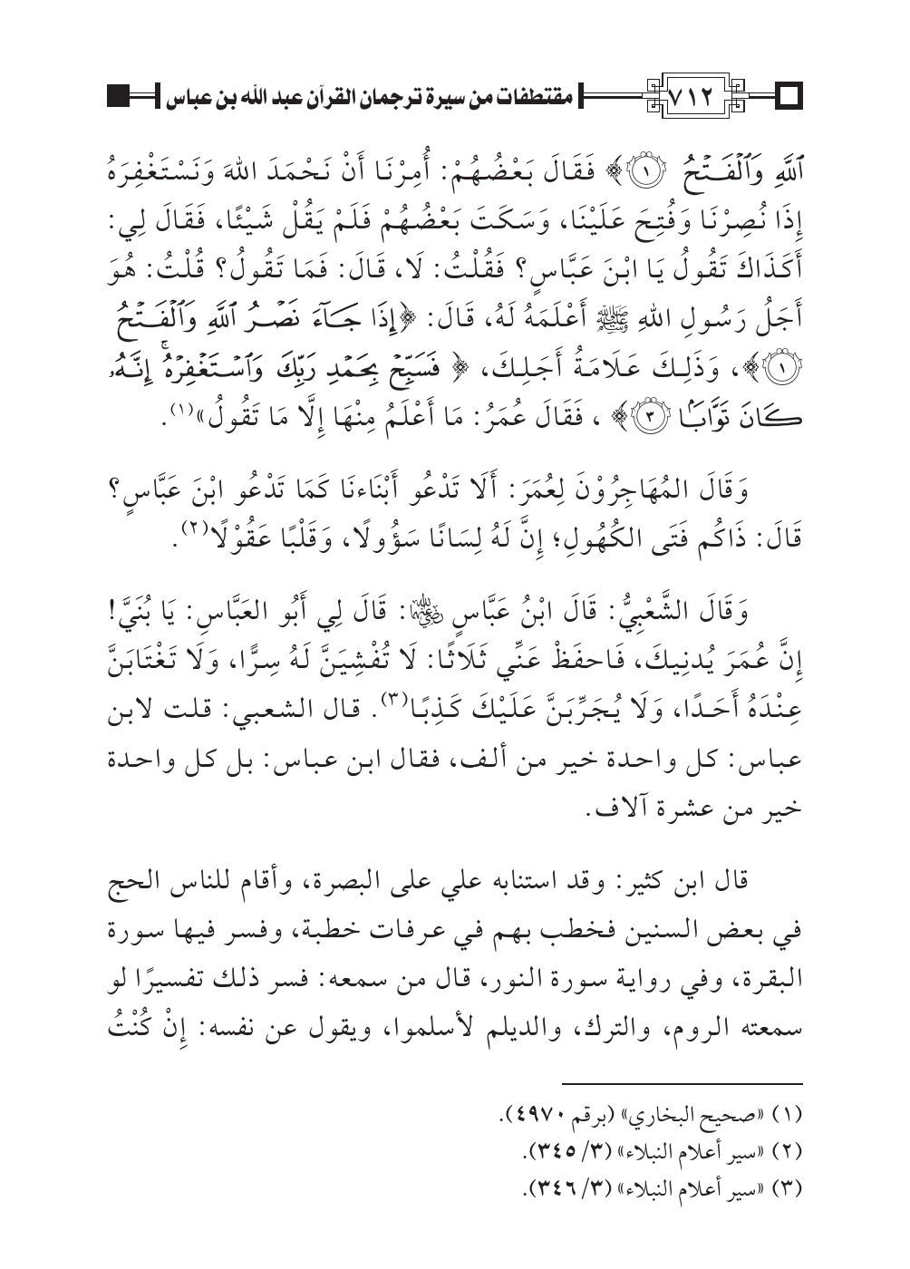 اللَّهِ وَالْفَتْح (١)} فَقَالَ بَعْضُهُمْ: أُمِرْنَا أَنْ نَحْمَدَ اللهَ وَنَسْتَغْفِرَهُ إِذَا نُصِرْنَا وَفُتِحَ عَلَيْنَا، وَسَكَتَ بَعْضُهُمْ فَلَمْ يَقُلْ شَيْئًا، فَقَالَ لِي: أَكَذَاكَ تَقُولُ يَا ابْنَ عَبَّاسٍ؟ فَقُلْتُ: لَا، قَالَ: فَمَا تَقُولُ؟ قُلْتُ: هُوَ أَجَلُ رَسُولِ اللهِ صلى اللهُ عليه وسلم أَعْلَمَهُ لَهُ، قَالَ: {إِذَا جَاء نَصْرُ اللَّهِ وَالْفَتْح (١)}، وَذَلِكَ عَلَامَةُ أَجَلِكَ، {فَسَبِّحْ بِحَمْدِ رَبِّكَ وَاسْتَغْفِرْهُ إِنَّهُ كَانَ تَوَّابًا (٣)}، فَقَالَ عُمَرُ: مَا أَعْلَمُ مِنْهَا إِلَّا مَا تَقُولُ» (¬١).