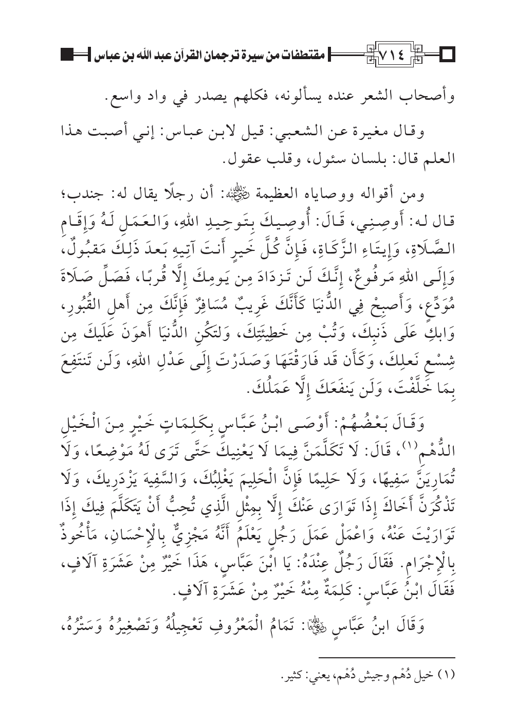 وَقَالَ بَعْضُهُمْ: أَوْصَى ابْنُ عَبَّاسٍ بِكَلِمَاتٍ خَيْرٍ مِنَ الْخَيْلِ الدُّهْمِ (¬١)، قَالَ: لَا تَكَلَّمَنَّ فِيمَا لَا يَعْنِيكَ حَتَّى تَرَى لَهُ مَوْضِعًا، وَلَا تُمَارِيَنَّ سَفِيهًا، وَلَا حَلِيمًا فَإِنَّ الْحَلِيمَ يَغْلِبُكَ، وَالسَّفِيهَ يَزْدَرِيكَ، وَلَا تَذْكُرَنَّ أَخَاكَ إِذَا تَوَارَى عَنْكَ إِلَّا بِمِثْلِ الَّذِي تُحِبُّ أَنْ يَتَكَلَّمَ فِيكَ إِذَا تَوَارَيْتَ عَنْهُ، وَاعْمَلْ عَمَلَ رَجُلٍ يَعْلَمُ أَنَّهُ مَجْزِيٌّ بِالْإِحْسَانِ، مَاخُوذٌ بِالْإِجْرَامِ. فَقَالَ رَجُلٌ عِنْدَهُ: يَا ابْنَ عَبَّاسٍ، هَذَا خَيْرٌ مِنْ عَشَرَةِ آلَافٍ، فَقَالَ ابْنُ عَبَّاسٍ: كَلِمَةٌ مِنْهُ خَيْرٌ مِنْ عَشَرَةِ آلَافٍ.