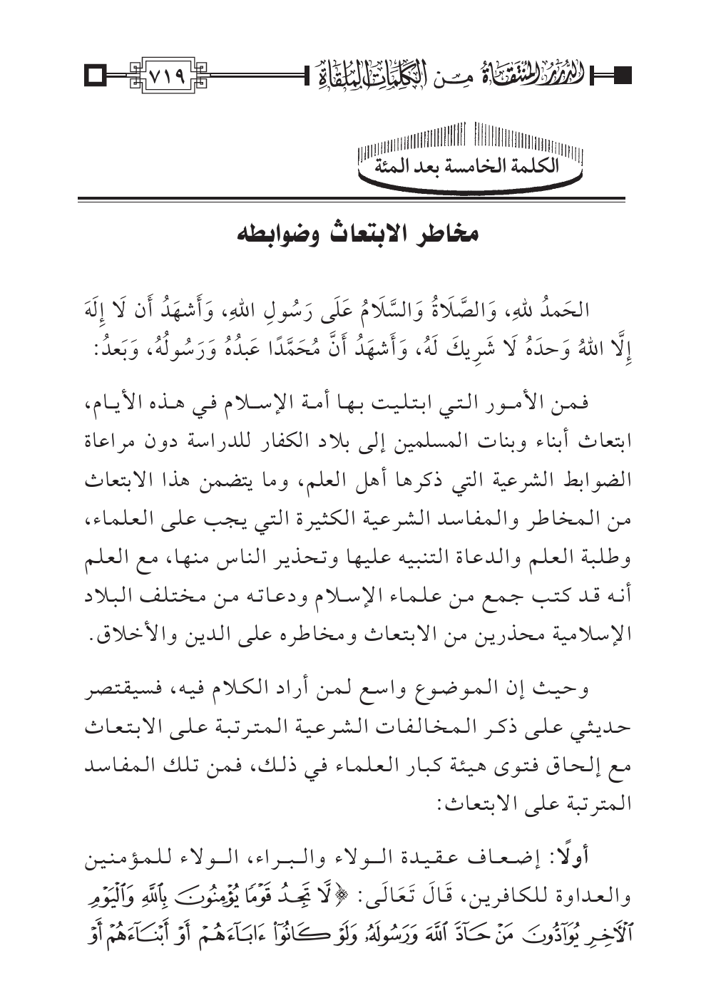 أولًا: إضعاف عقيدة الولاء والبراء، الولاء للمؤمنين والعداوة للكافرين، قَالَ تَعَالَى: {لَا تَجِدُ قَوْمًا يُؤْمِنُونَ بِاللَّهِ وَالْيَوْمِ الآخِرِ يُوَادُّونَ مَنْ حَادَّ اللَّهَ وَرَسُولَهُ وَلَوْ كَانُوا آبَاءهُمْ أَوْ أَبْنَاءهُمْ أَوْ