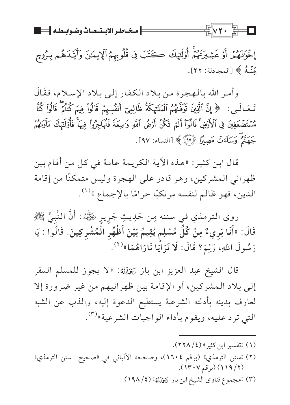 قال الشيخ عبد العزيز ابن باز رحمه الله: «لا يجوز للمسلم السفر إلى بلاد المشركين، أو الإقامة بين ظهرانيهم من غير ضرورة إلا لعارف بدينه بأدلته الشرعية يستطيع الدعوة إليه، والذب عن الشبه التي ترد عليه، ويقوم بأداء الواجبات الشرعية» (¬٣).
