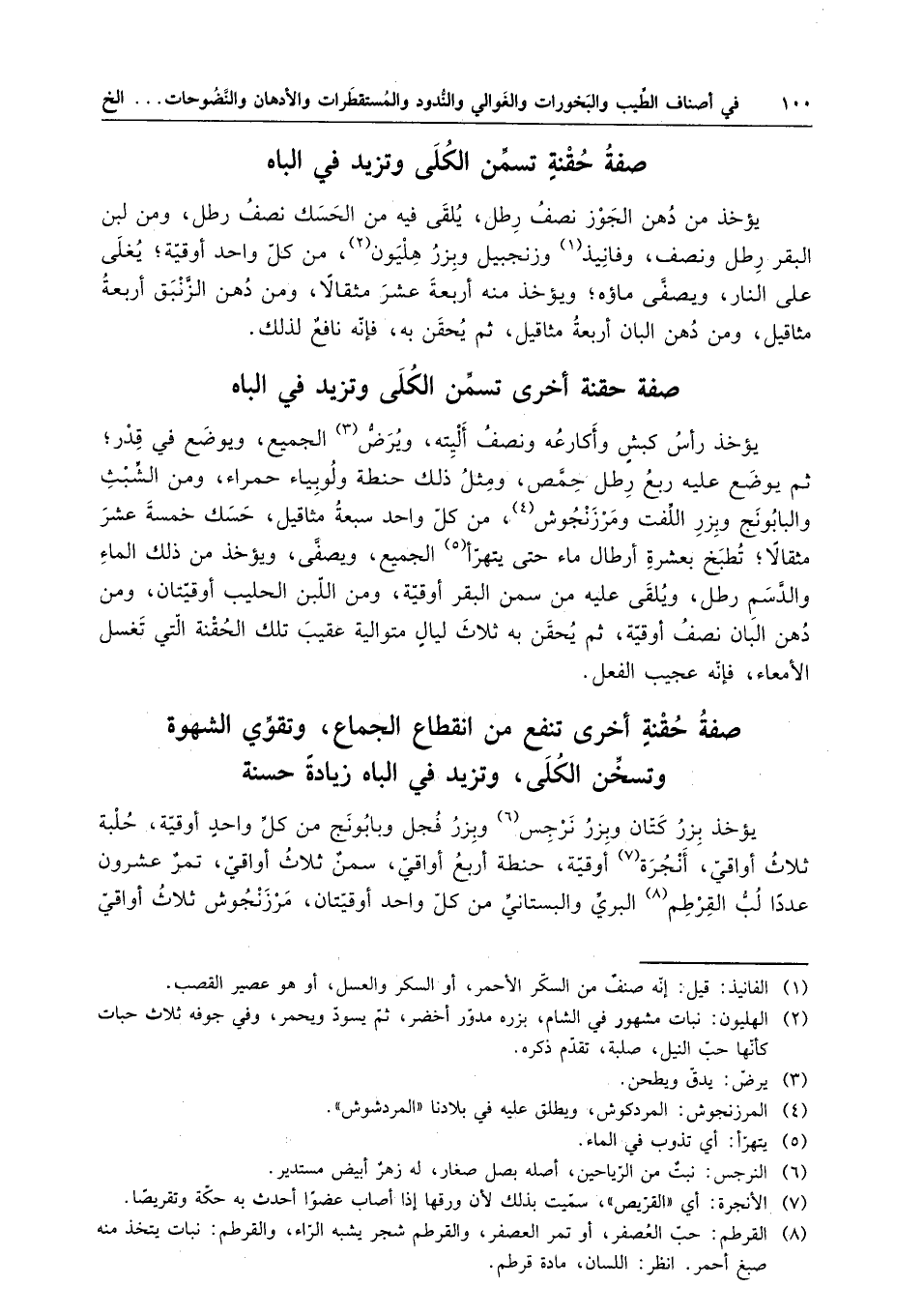 يؤخذ من دهن الجوز نصف رطل ، يلقى فيه من الحسك نصف رطل ، ومن لبن البقر رطل ونصف وفانيذ وزنجبيل وبزر هليون ، من كل واحد أوقية ، يغلى على النار ويصفى ماؤه ، ويؤخذ منه أربعة عشر مثقالاً ، ومن دهن الزنبق أربعة مثاقيل ، ومن دهن البان أربعة مثاقيل ، ثم يحقن به ، فانه نافع لذلك .