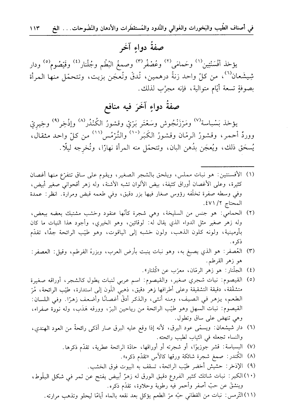 يؤخذ أفسنتين وحمامي وعصفر وصمغ البطم وجلنار وقيصوم ودار شيشعان ، من كل واحد زنة درهمين ؛ تدق وتعجن بزيت ، وتتحمل منه المرأة بصوفة تسعة أيام متوالية ، فإنه مجرب لذلك .