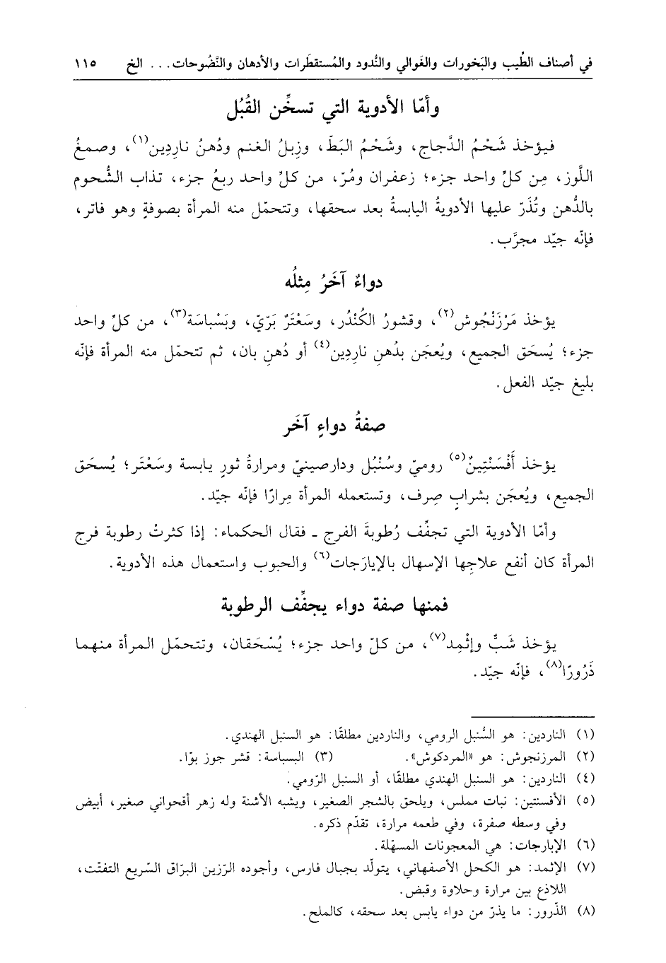 فيؤخذ شحم الدجاج ، وشحم البط ، وزبل الغنم ودهن ناردين ، وصمغ اللوز ، من كل واحد جزء ، زعفران ومر ، من كل واحد ربع جزء ، تذاب الشحوم بالدهن وتذر عليها الأدوية اليابسة بعد سحقها ، وتتحمل منه المرأة بصوفة وهو فاتر ، فإنه جيد مجرب .