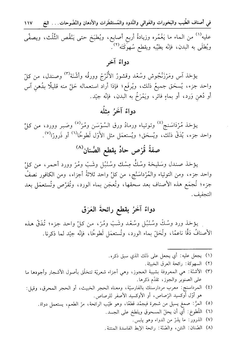 يؤخذ صندل وسليخة وسك مسك وسنلل وشب ومر وورد أحمر ، من كل واحد جزء ، ومن التوتياء والمرداسنج ، من كل واحد ثلاثة أجزاء ، ومن الكافور نصف جزء ؛ تجمع هذه الأصناف بعد سحقهان وتعجن بماء الوردن وتقرص وتستعمل بعد التجفيف .