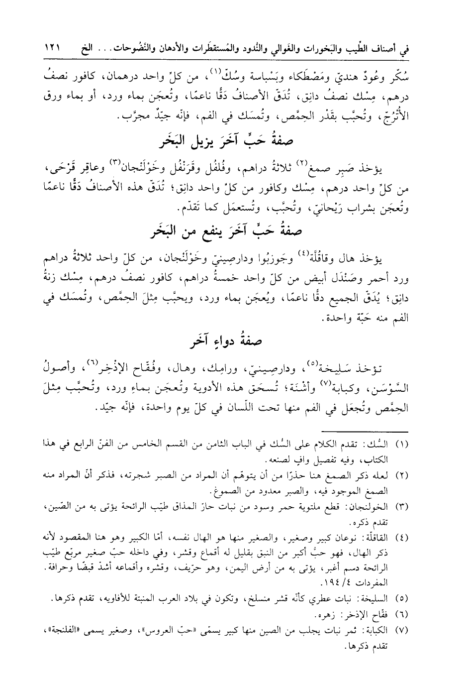تؤخذ سليخة ، ودارصينين ورامك ، وهال ، وفقاح الإدخر ، وأصول السوسن وكبابة وأشنة ؛ تسحق هذه الأدوية ، وتعجن بماء ورد ، وتحبب مثل الحمص وتجعل في الفم منها تحت اللسان في كل يوم واحدة ، فإنه جيد .
