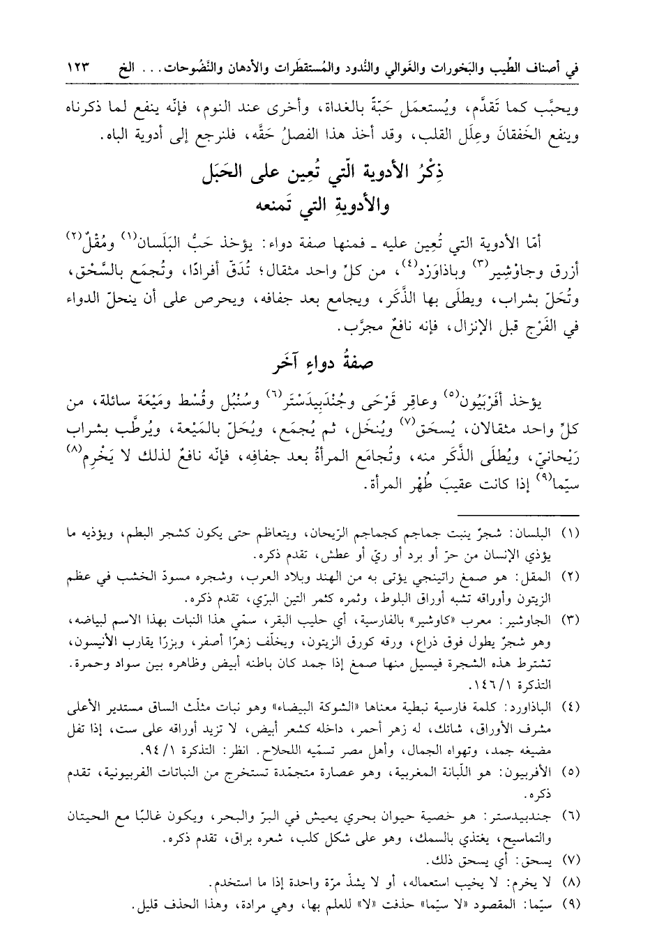 أما الأدوية التي تعين عليه - فمنها صفة دواء : يؤخذ حب البلسان ومقل أزرق وجاوشير وباذاورد ، من كل واحد مثقال ؛ تدق أفراداً ، وتجمع بالسحق ، وتحل بشراب ، ويطلي بها الذكر ، ويجامع بعد جفافه ، ويحرص على أن ينحل الدواء في الفرج قبل الإنزال ، فإنه نافع مجرب .