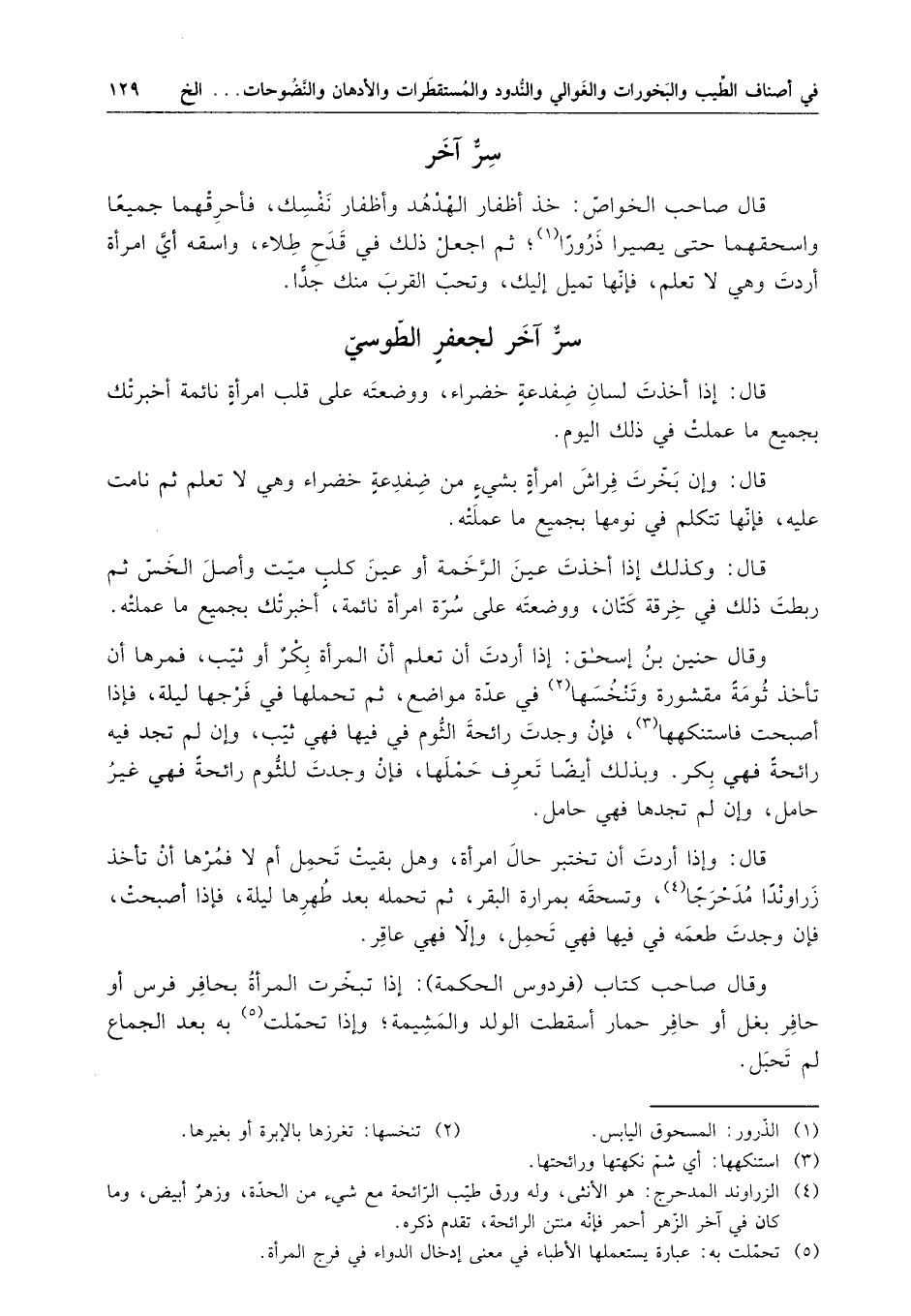 قال : وإذا أردت أن تخبر حال امرأة ، وهل بقيت تحمل أم لا فمرها أن تأخذ زراوندا مدحرجاً ، وتسحقه بمرارة البقر ، ثم تحمله بعد طهرها ليلة ، فإذا أصبحت ، فإن وجدت طعمة في فيها فهي تحمل ، وإلا فهي عاقر .