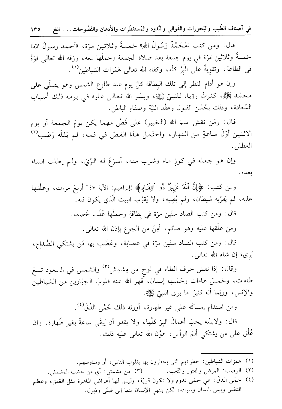 قال : ولا يحب أعمال البر كلها ، ولا يقدر أن يبقى ساعة بغير طهارة . وإن علق على من يشتكي ألم الرأس ، هون الله تعالى عليه ذلك .