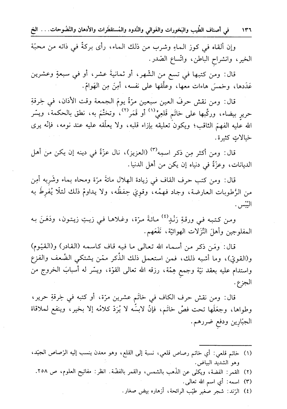 قال : ومن نقش حرف العين سبعين مرة يوم الجمعة وقت الأذان ، في خرقة حرير بيضاء ، وركبها على خاتم قلعي أو قمر ، وتختم به ، نطق بالحكمة ، ويسر الله عليه الفهم الثاقب ؛ ويكون تعليقه بإزاء قلبه ، ولا يعلقه عليه عند نومه ، فإنه يرى خيالات كثيرة .