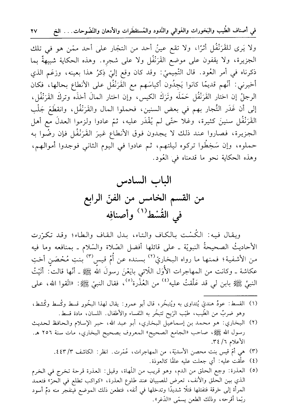 ويقال فيه : الكست بالكاف والتاء ، بدل القاف والطاء ؛ وقد تكررت الأحاديث الصحيحة النبوية - على قائلها أفضل الصلاة والسلام - بمنافعه وما فيه من الأشفية ؛ فمنها ما رواه البخاري بسنده عن أم قيس بنت محصن أخت عكاشة ، - وكانت من المهاجرات الأول اللاتي بايعن رسول الله ( صلى الله عليه وسلم ) - أنها قالت : أتيت النبي ( صلى الله عليه وسلم ) بابن لي قد علقت عليه من العذرة فقال النبي ( صلى الله عليه وسلم ) : " اتقوا الله ، على